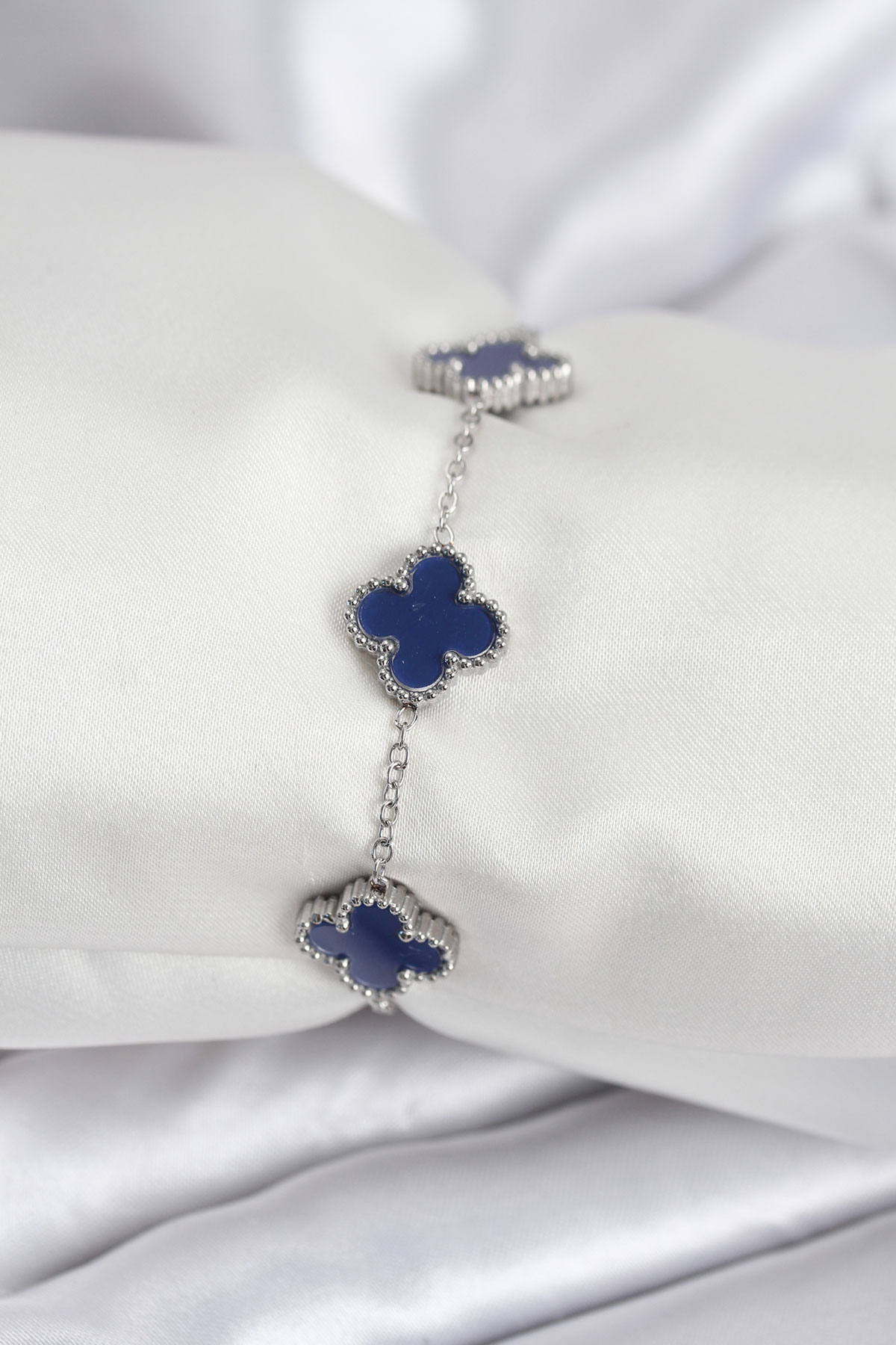 316L Çelik Zincir Gümüş Renk Lacivert Yonca Kadın Bileklik - 265743