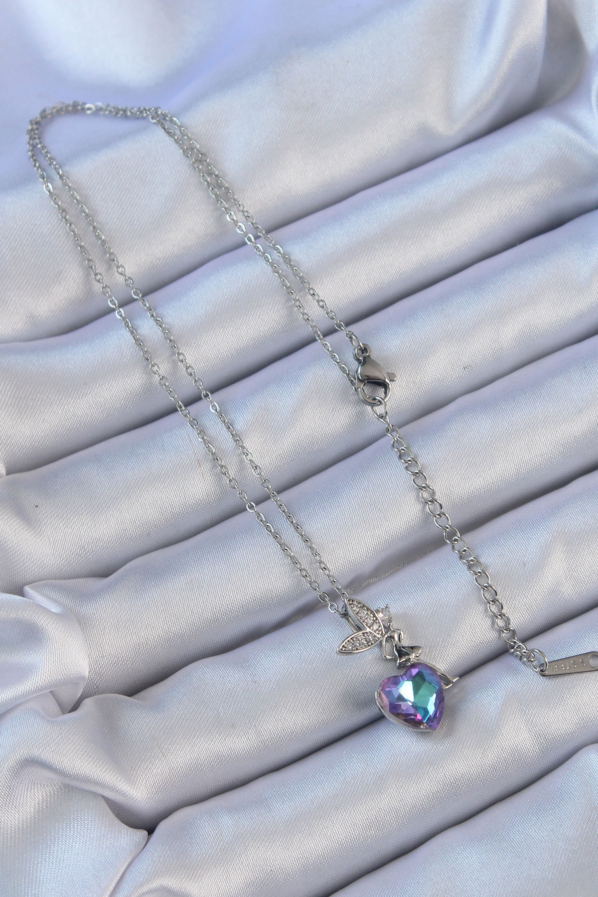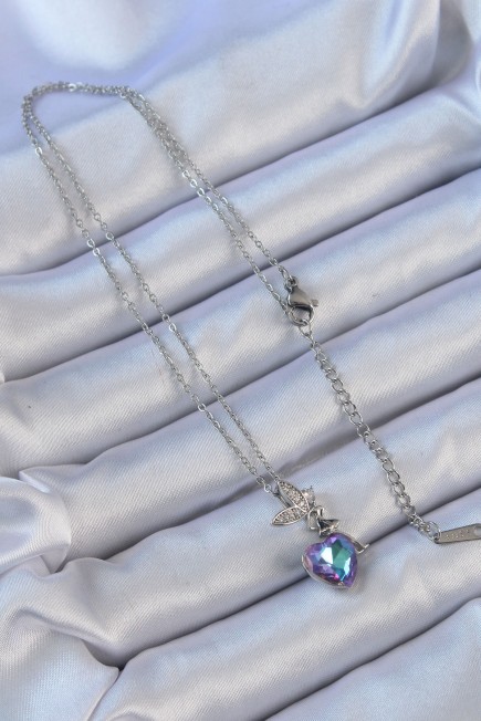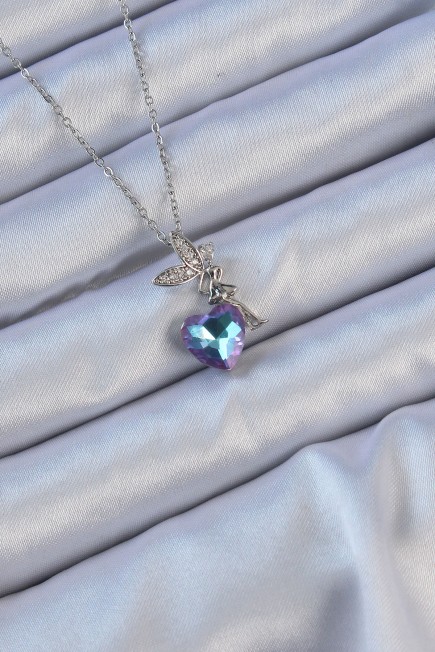 316L Çelik Zincir Gümüş Renk Mor Mavi Renk Zirkon Taşlı Kalp Detay Peri Kolye - 256914