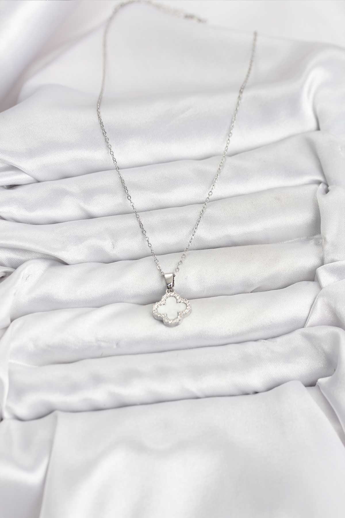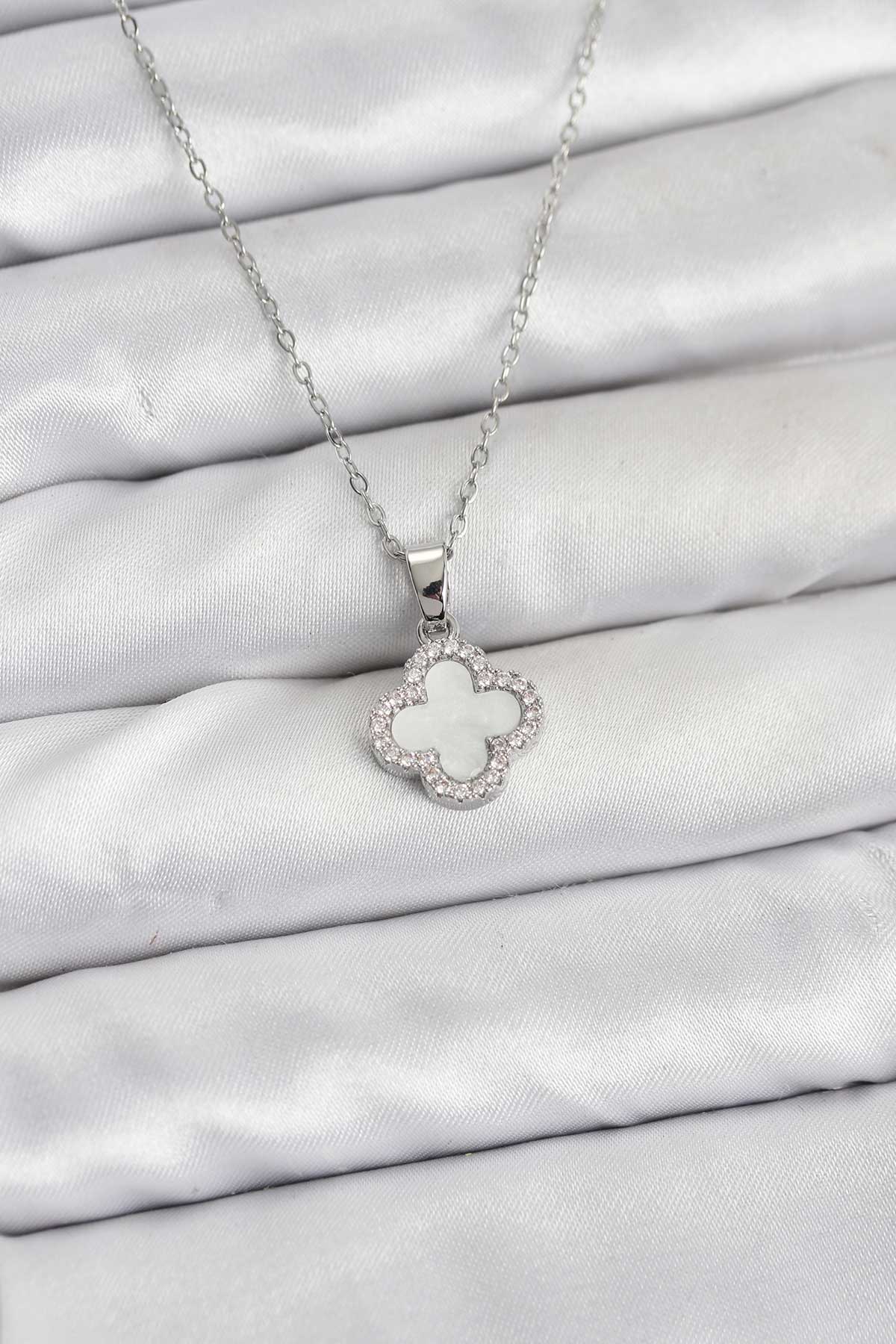 316L Çelik Zincir Gümüş Renk Sedefli Yonca Kadın Kolye - 266660