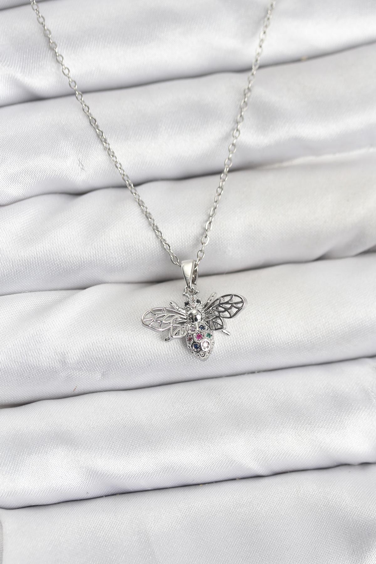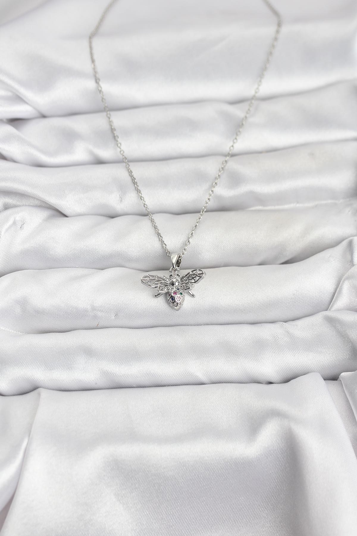 316L Çelik Zincir Gümüş Renk Sinek Model Zirkon Taşlı Kadın Kolye - 267137