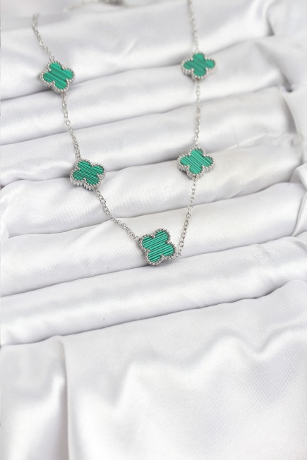 316L Çelik Zincir Gümüş Renk Yeşil Yonca Kadın Kolye - 265675