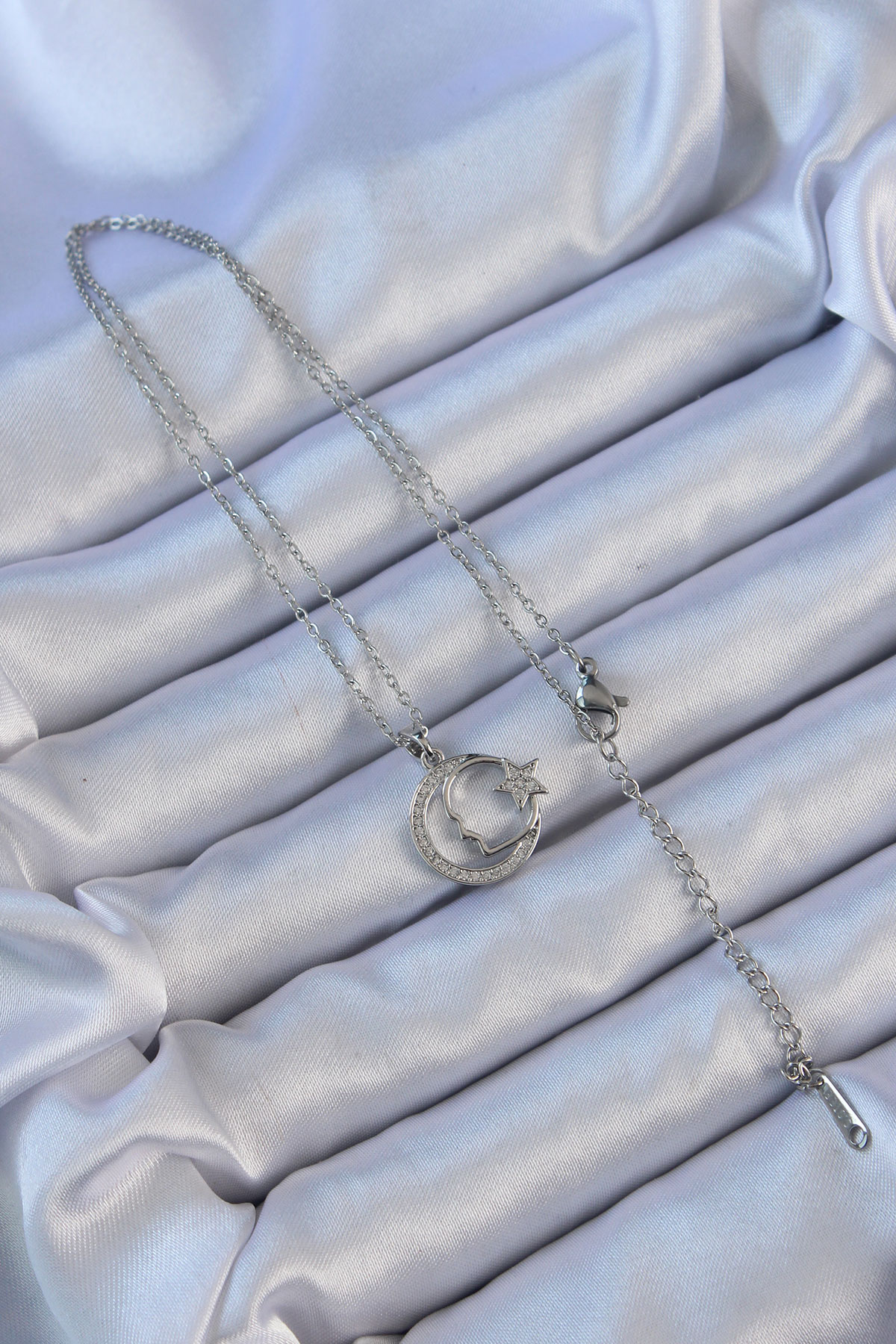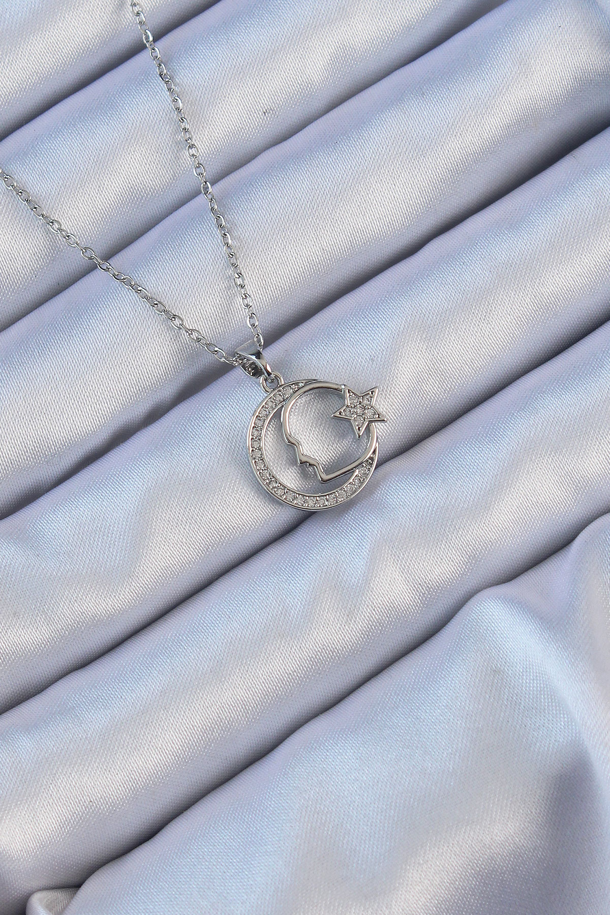 316L Çelik Zincir Gümüş Renk Zirkon Taşlı Ay Yıldız Simgeli Atatürk Kolye - 256904