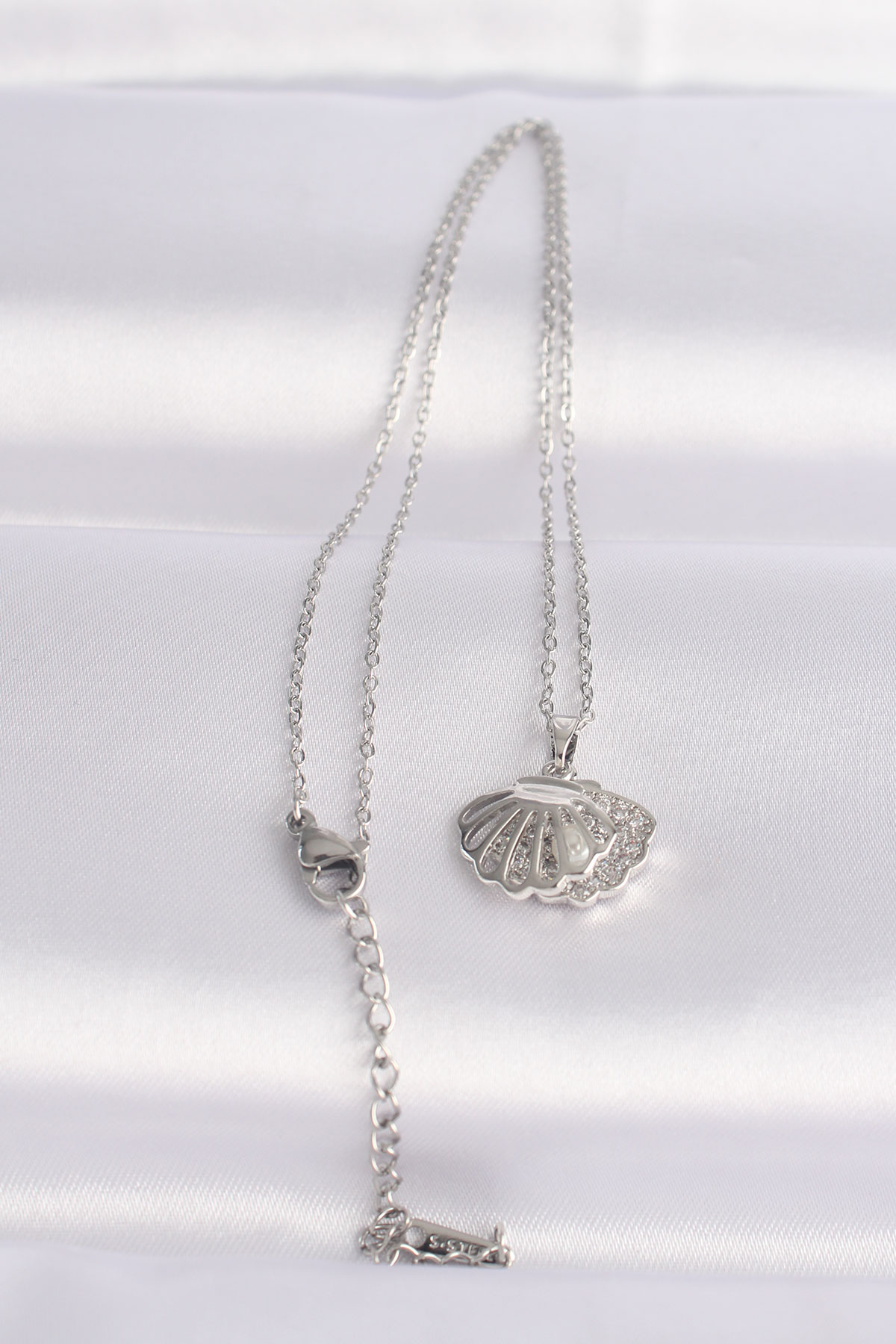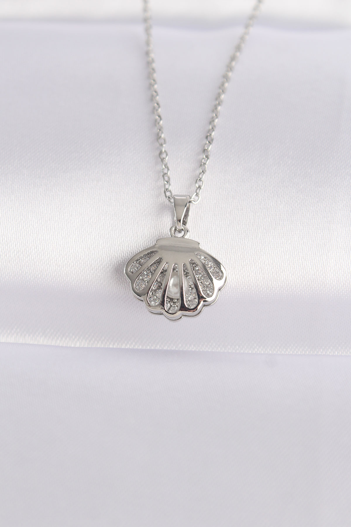 316L Çelik Zincir Gümüş Renk Zirkon Taşlı İnci Detay İstiridye Kolye - 255195