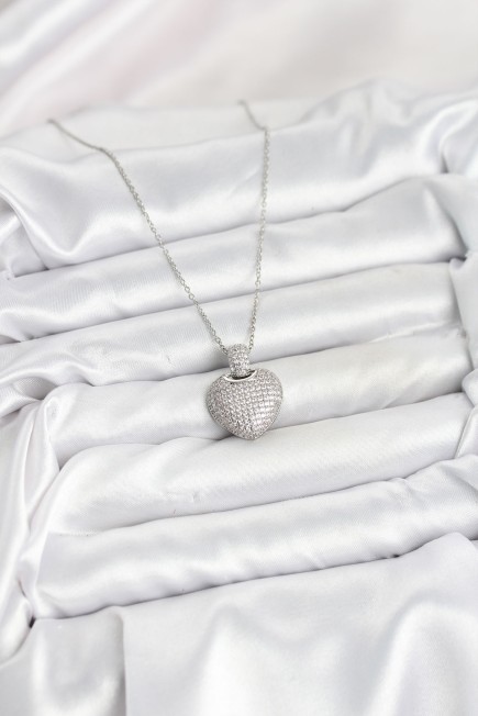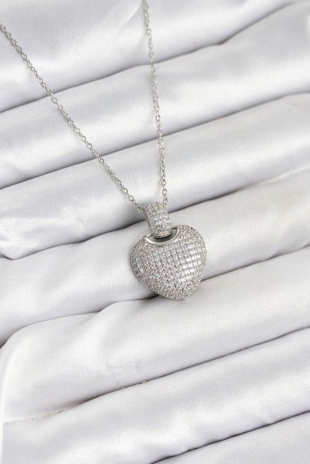 316L Çelik Zincir Gümüş Renk Zirkon Taşlı Kalpli Kadın Kolye - 266182