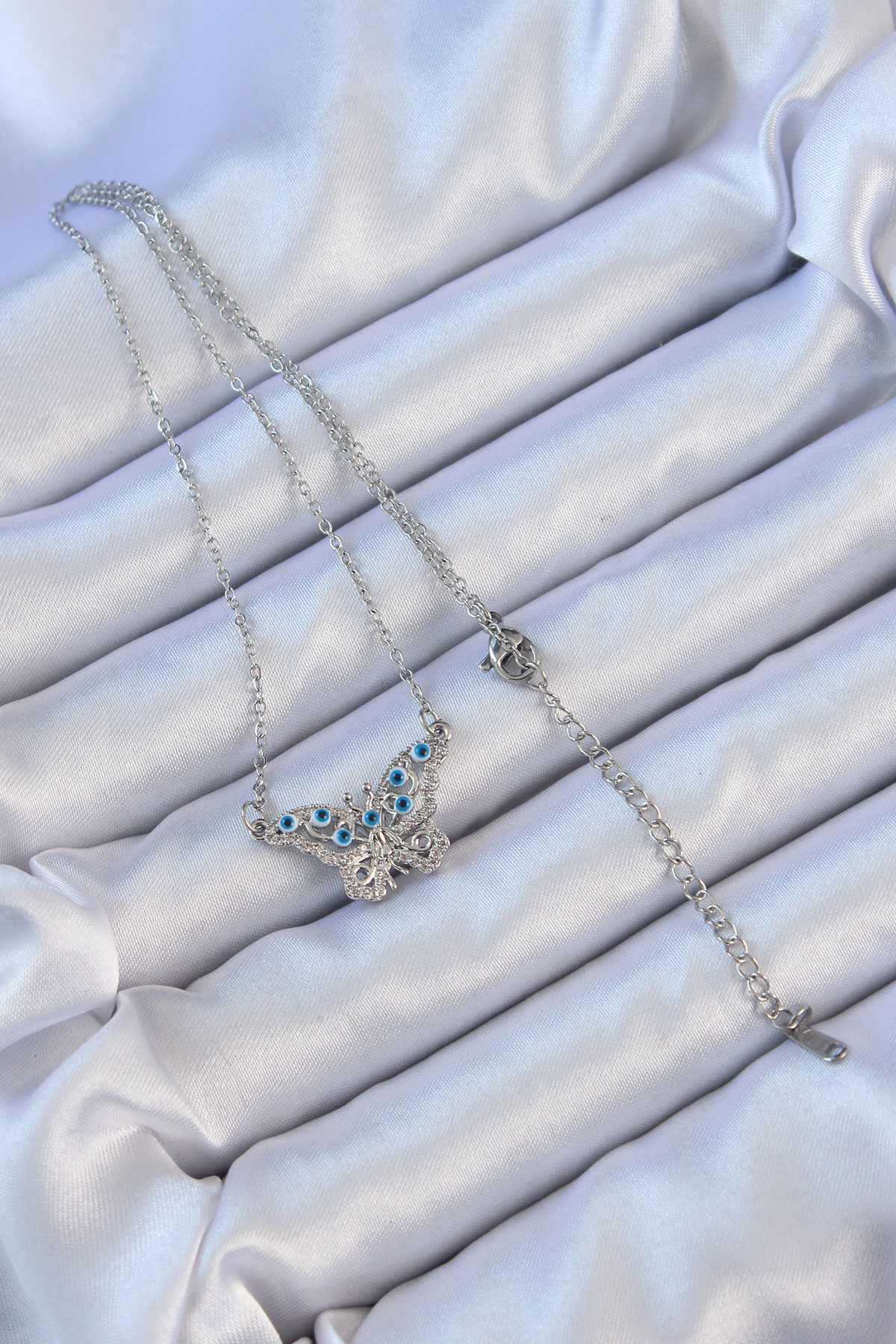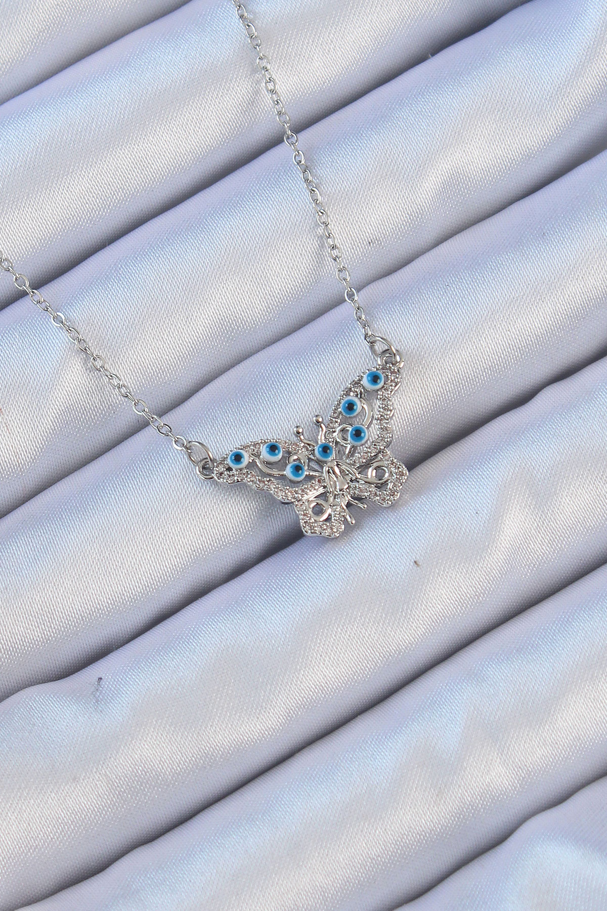 316L Çelik Zincir Gümüş Renk Zirkon Taşlı Nazarlı Kelebek Kolye - 256888