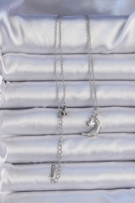 316L Çelik Zincir Gümüş Renk Zirkon Taşlı Sallantılı Ay Yıldız Kolye - 256848