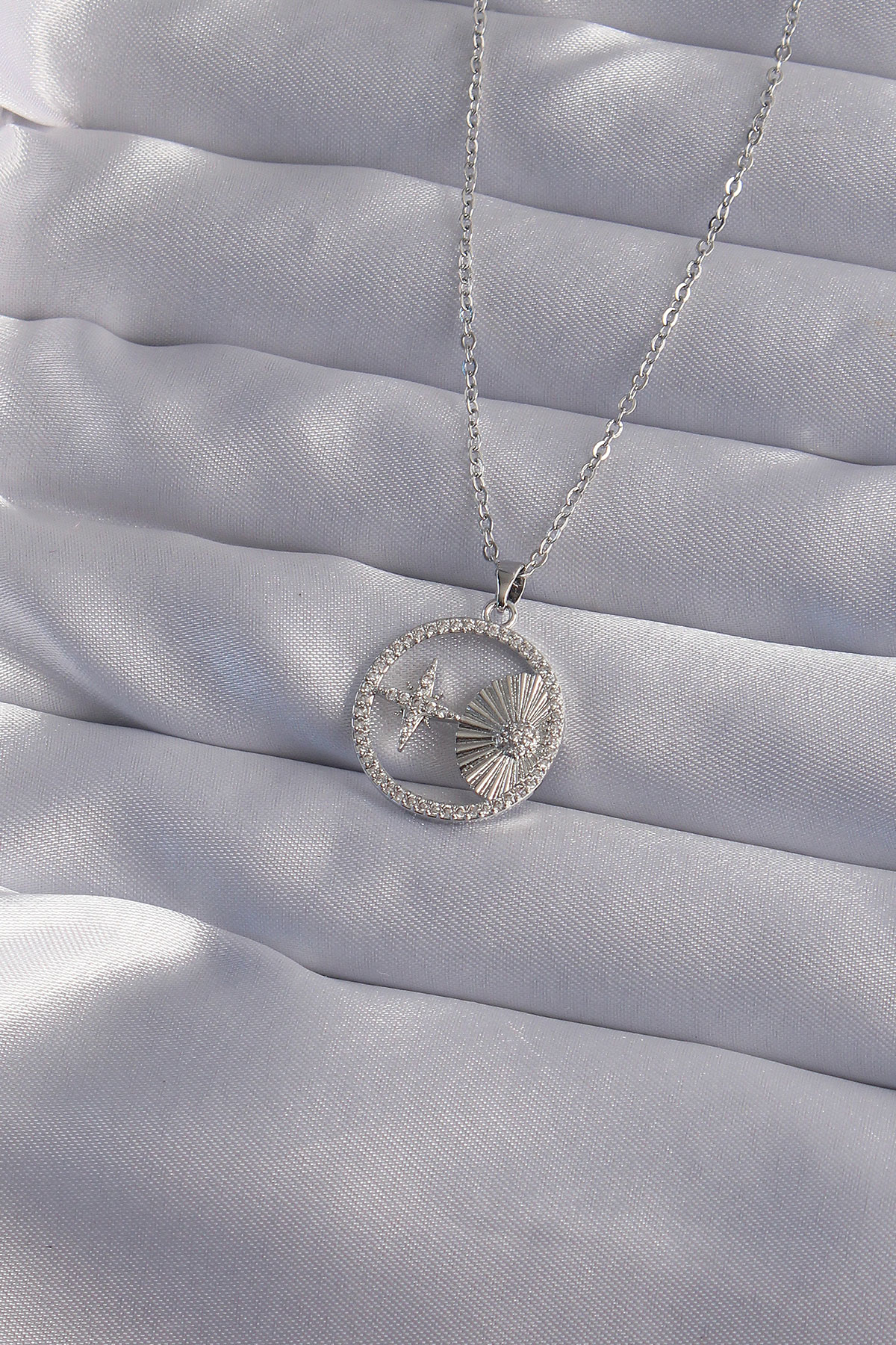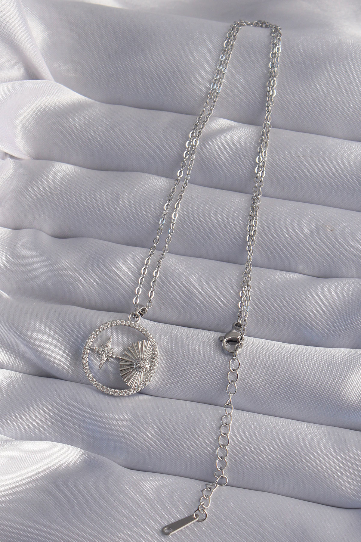 316L Çelik Zincir Gümüş Renk Zirkon Taşlı Yıldız Figürlü Oval Kolye - 256762