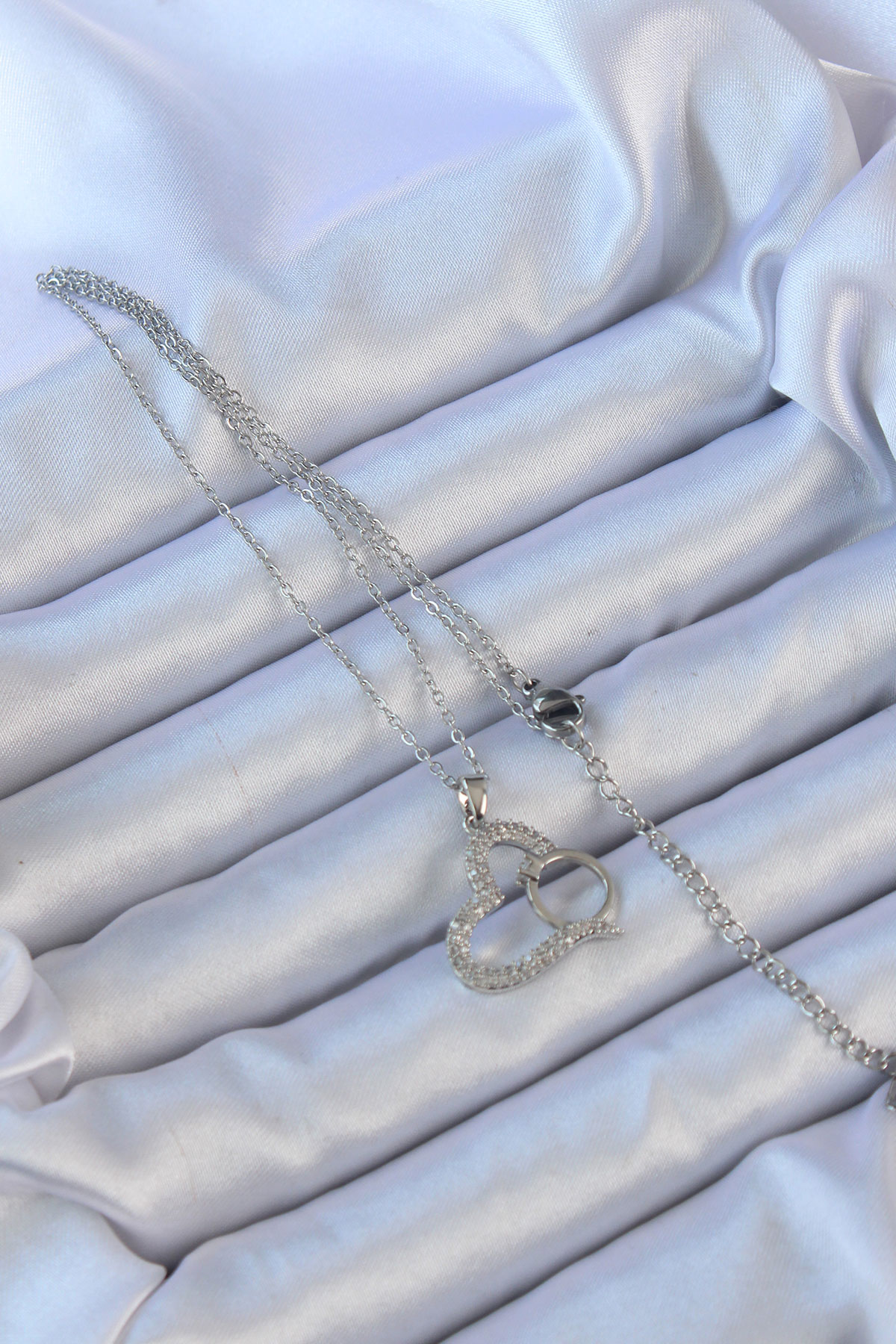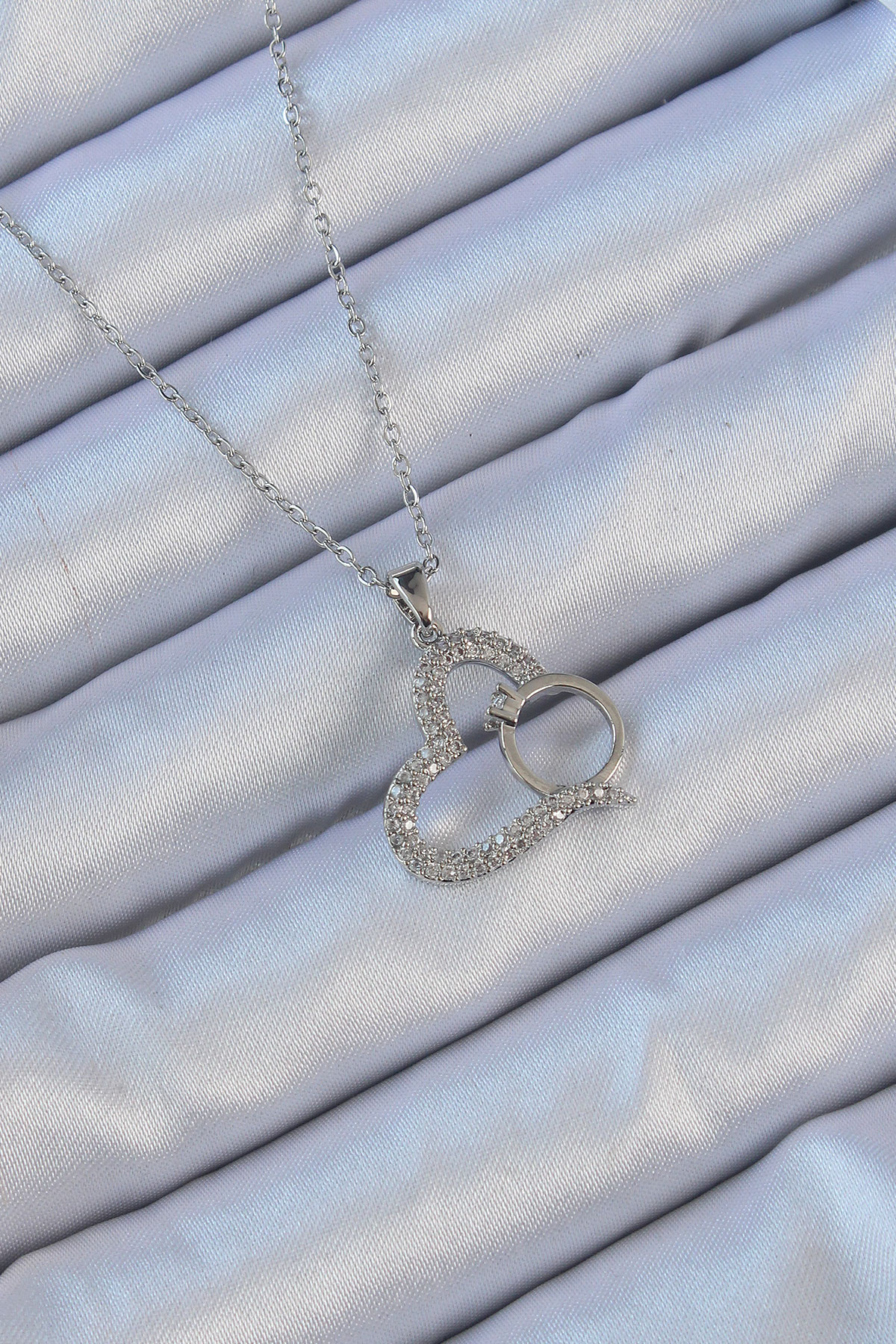 316L Çelik Zincir Gümüş Renk Zirkon Taşlı Yüzüklü Kalp Kolye - 256932