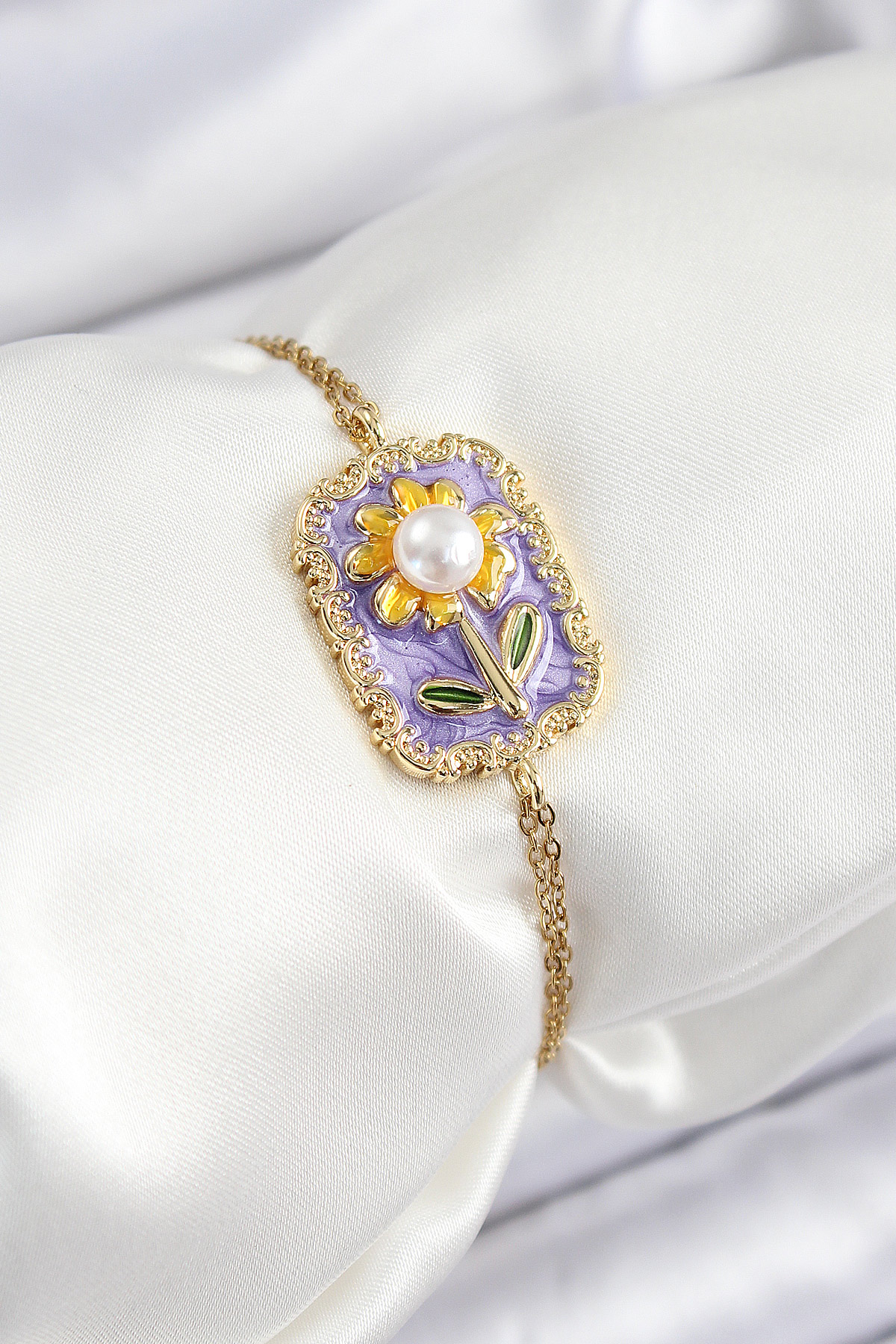 316L Çelik Zincir Mor Mineli Sanatsal Portre İnci Detaylı Papatya Model Gold Renk Kadın Bileklik - 263481