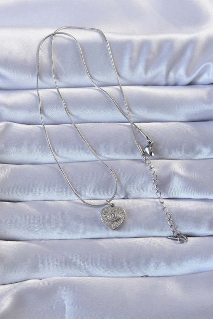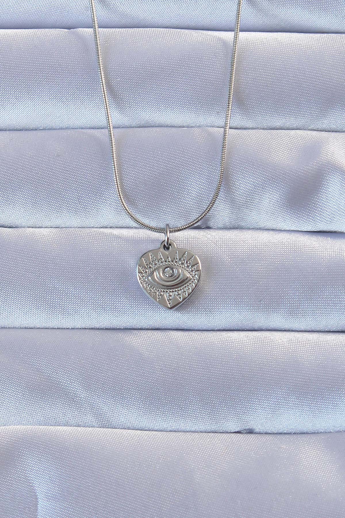 316L Gümüş Renk Zirkon Taşlı İşlemeli Göz Detay Kalp Kolye - 257564