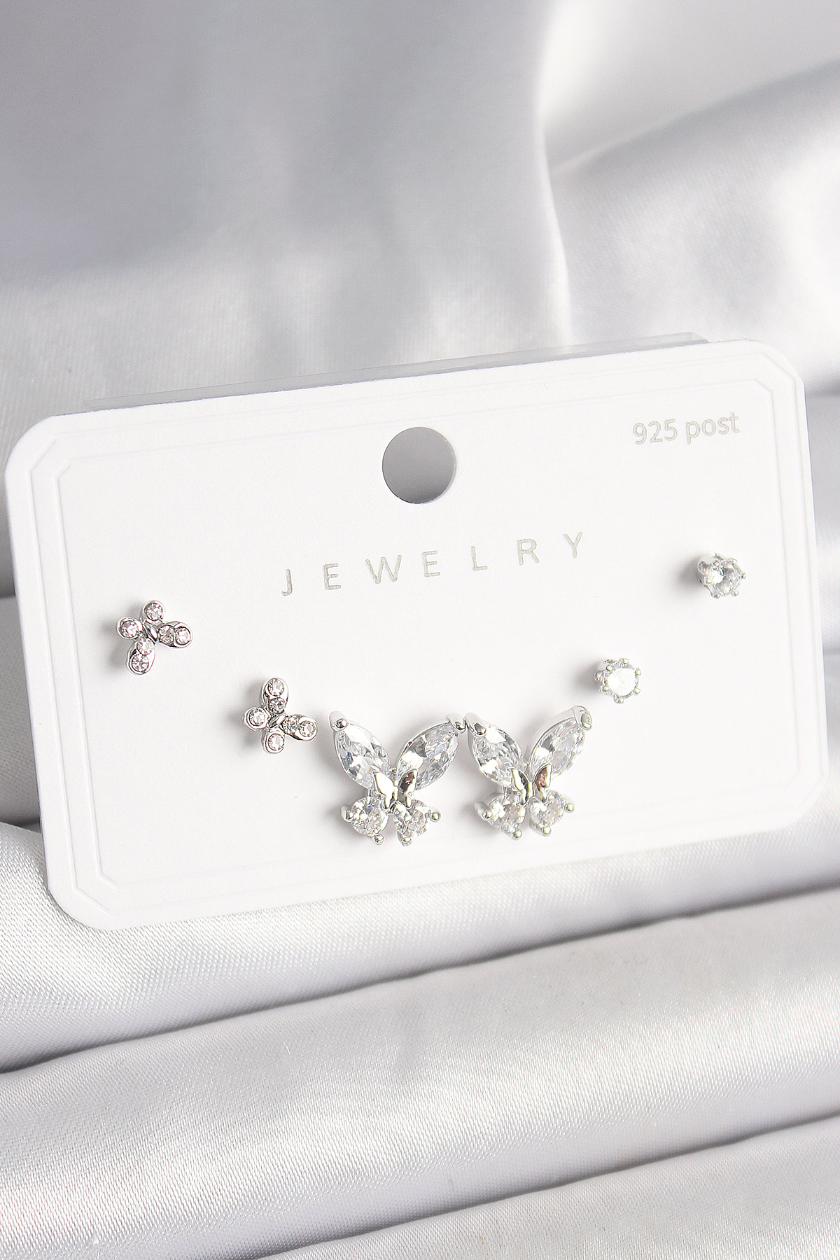 925 Ayar Gümüş Çivi Pirinç Zirkon Taşlı Kelebek Model Kadın Küpe Seti - 261536