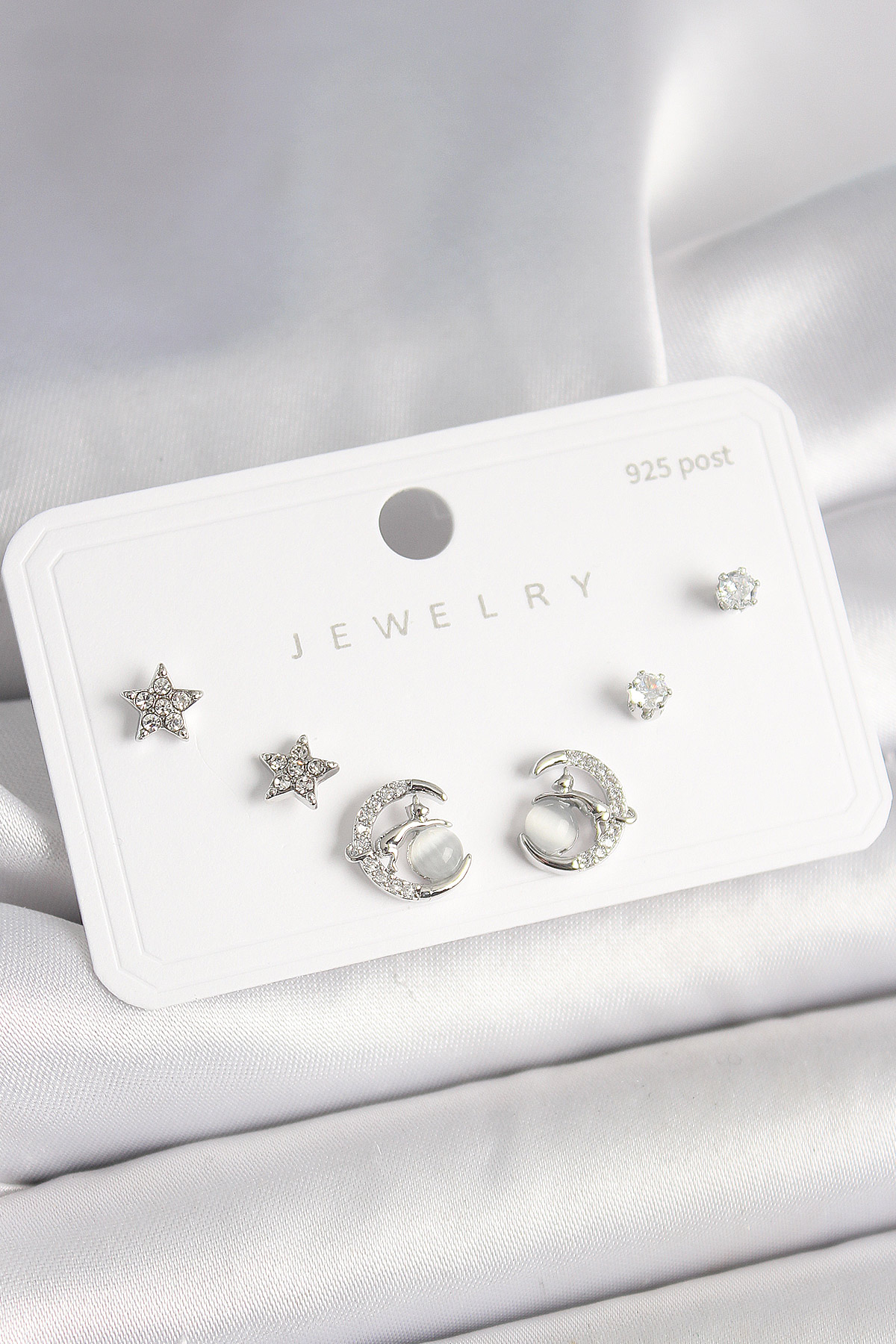 925 Ayar Gümüş Çivi Zirkon Taşlı Hilal Yıldız Model Kadın Küpe Seti - 261532