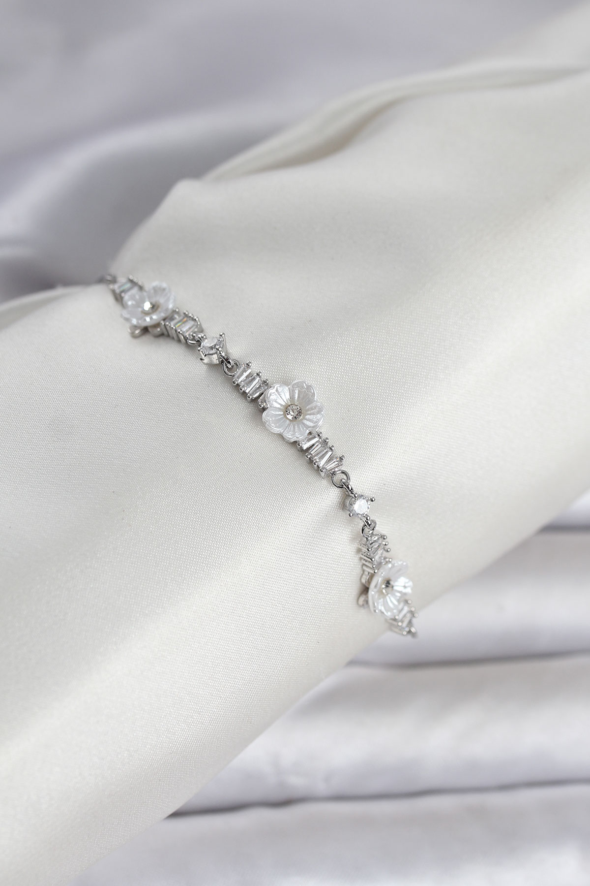 Baget Zirkon Taşlı Çiçek Model Gümüş Renk Asansörlü Kadın Bileklik - 267717