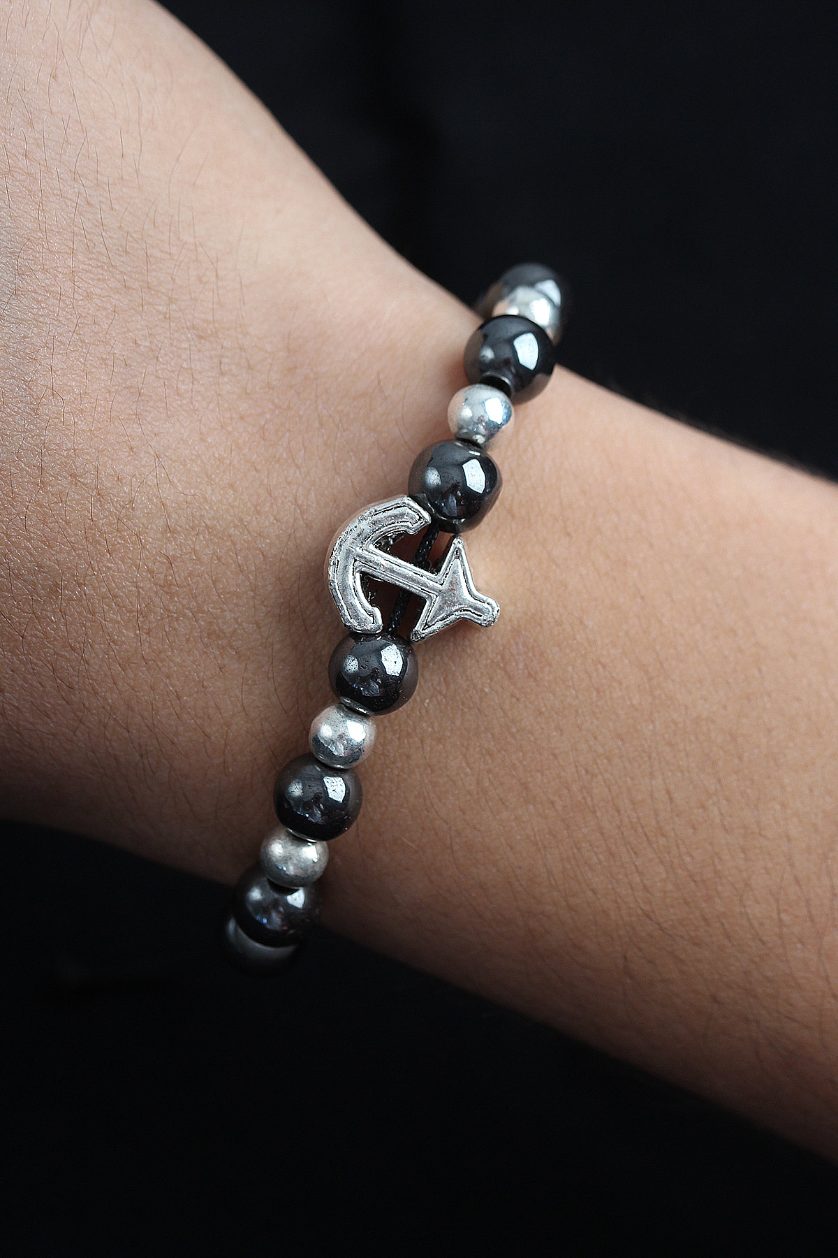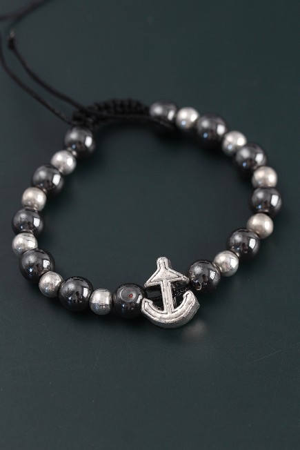 Doğal Taş Çapa Model Gümüş Ve Füme Renk Asansörlü Erkek Bileklik - 265486
