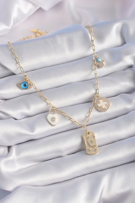 Gold Renk Zirkon Taşlı Çoklu Figür Model Şans Kolyesi - 257714