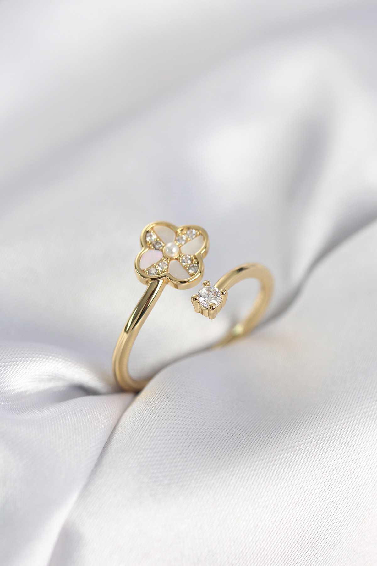 Gold Renk Zirkon Taşlı Yonca Model Kadın Yüzük - 267547