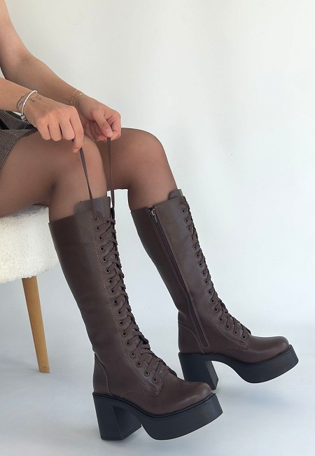 Guay Kahverengi Cilt Bağcıklı Topuklu Çizme - 265936