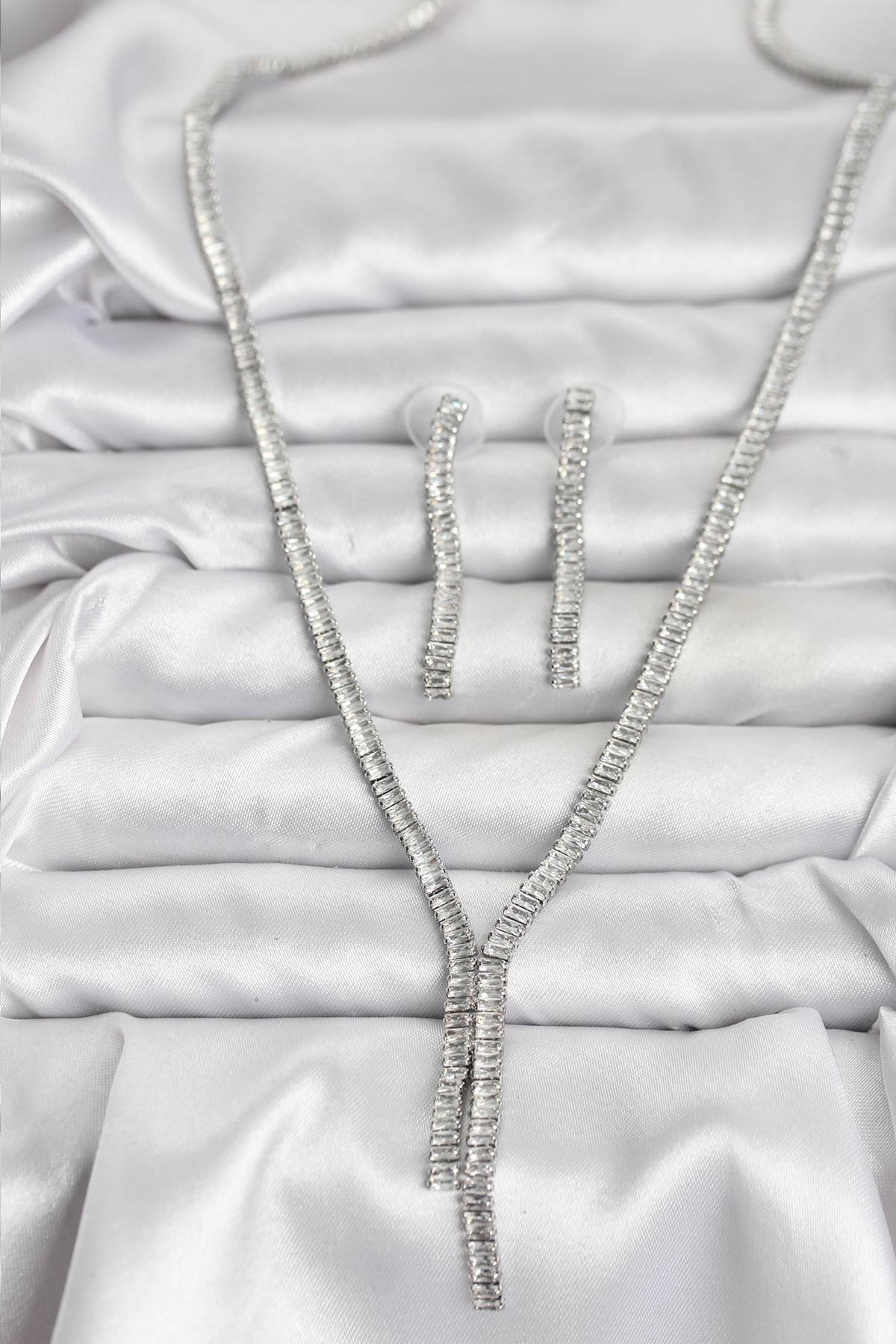 Gümüş Renk Baget Zirkon Taşlı Kadın Kolye Küpe Set - 266246