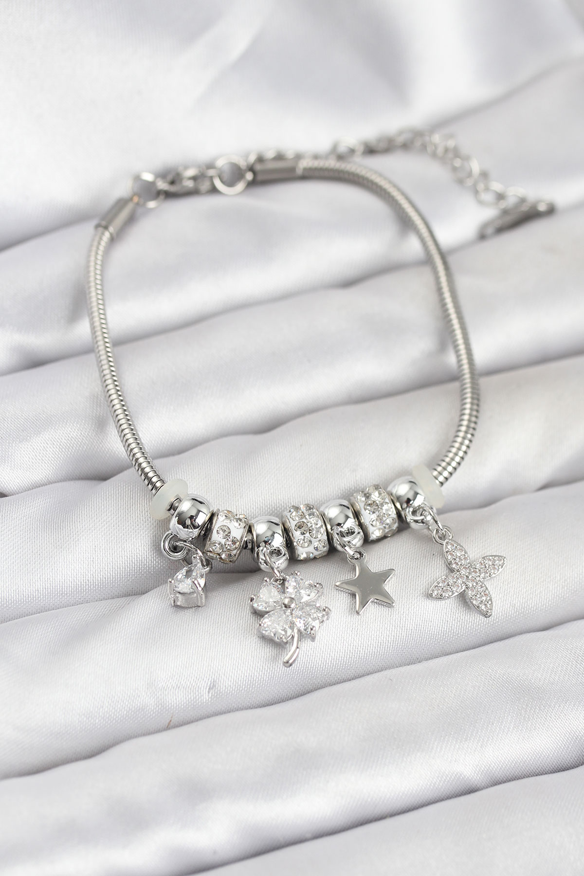 Gümüş Renk Pirinç Yonca Charmlı Kadın Bileklik - 266898