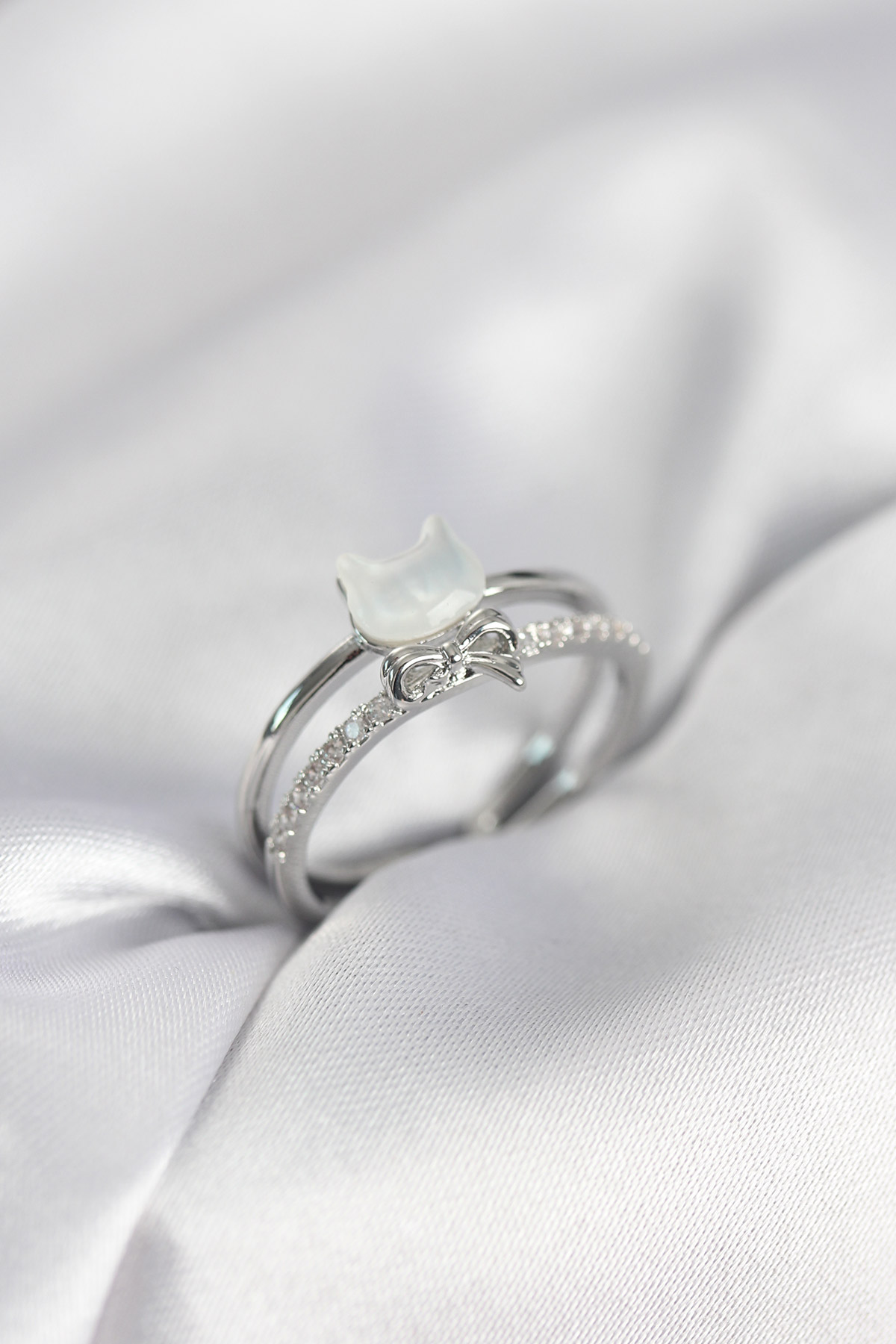 Gümüş Renk Sedefli Kedi Model Fiyonklu Zirkon Taşlı Kadın Yüzük - 267558