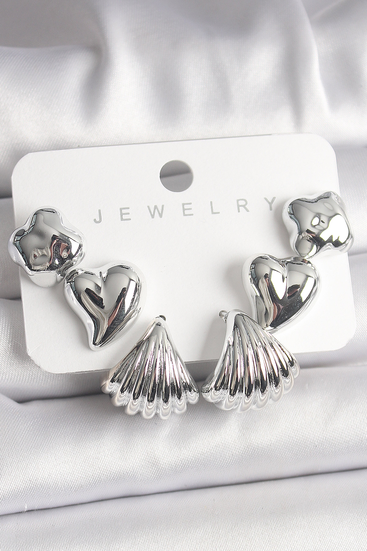 Gümüş Renk Yonca Kalp Deniz Kabuğu Figür CCB Kadın Küpe Seti - 260082