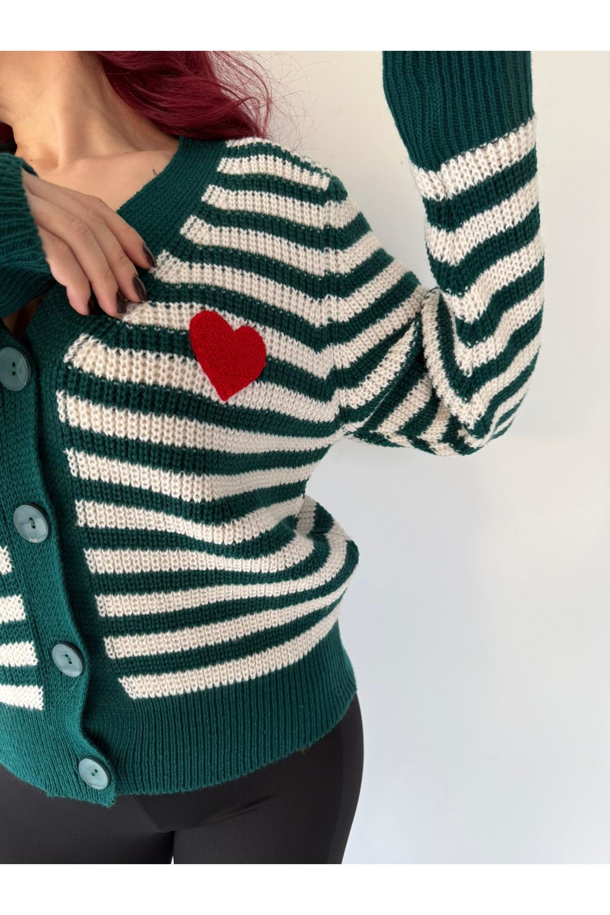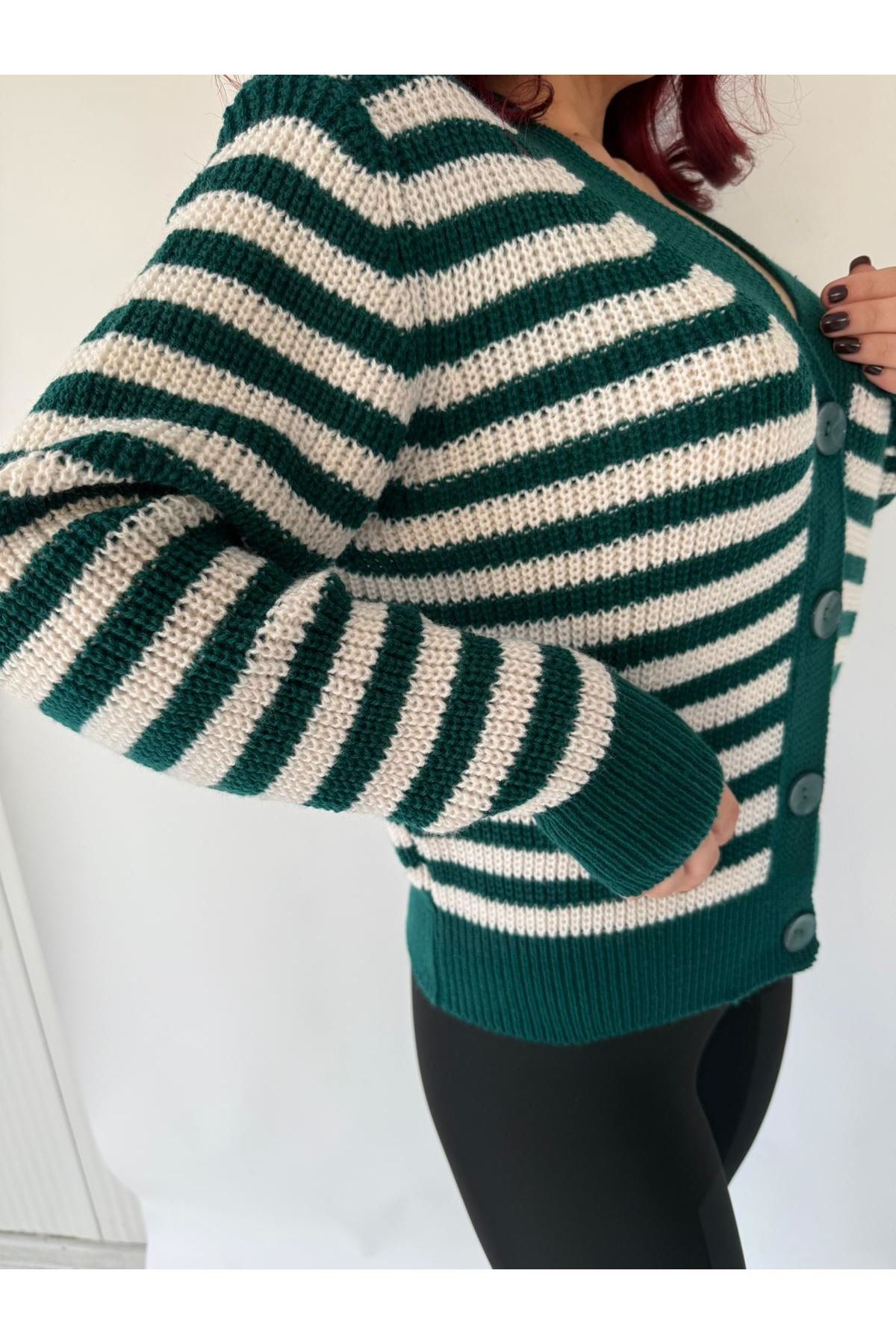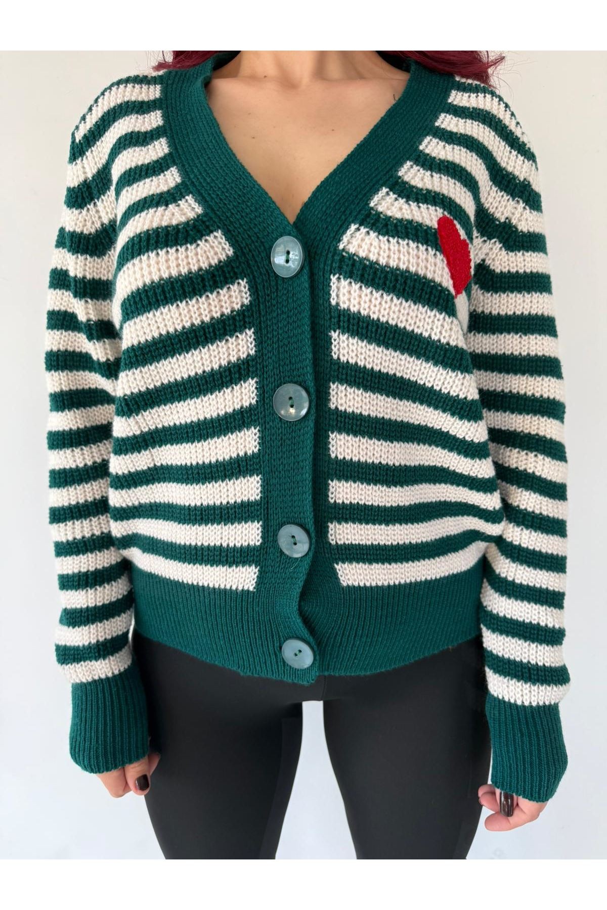 • Model: V yaka, uzun kollu, önden düğmeli,  kesimli triko hırka.