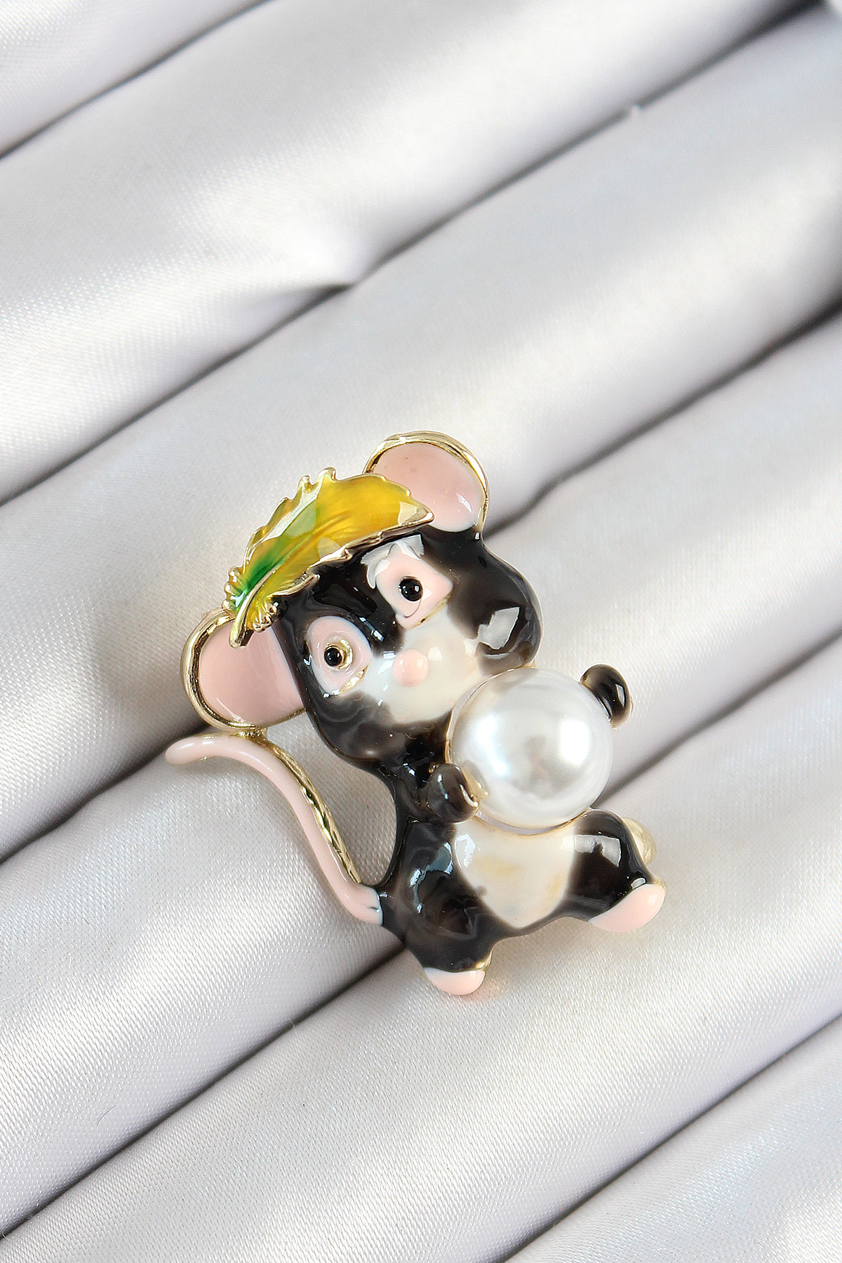 İnci Detaylı Siyah Ve Pembe 3D Sevimli Fare Figürlü Gold Renk Kadın Broş - 262859