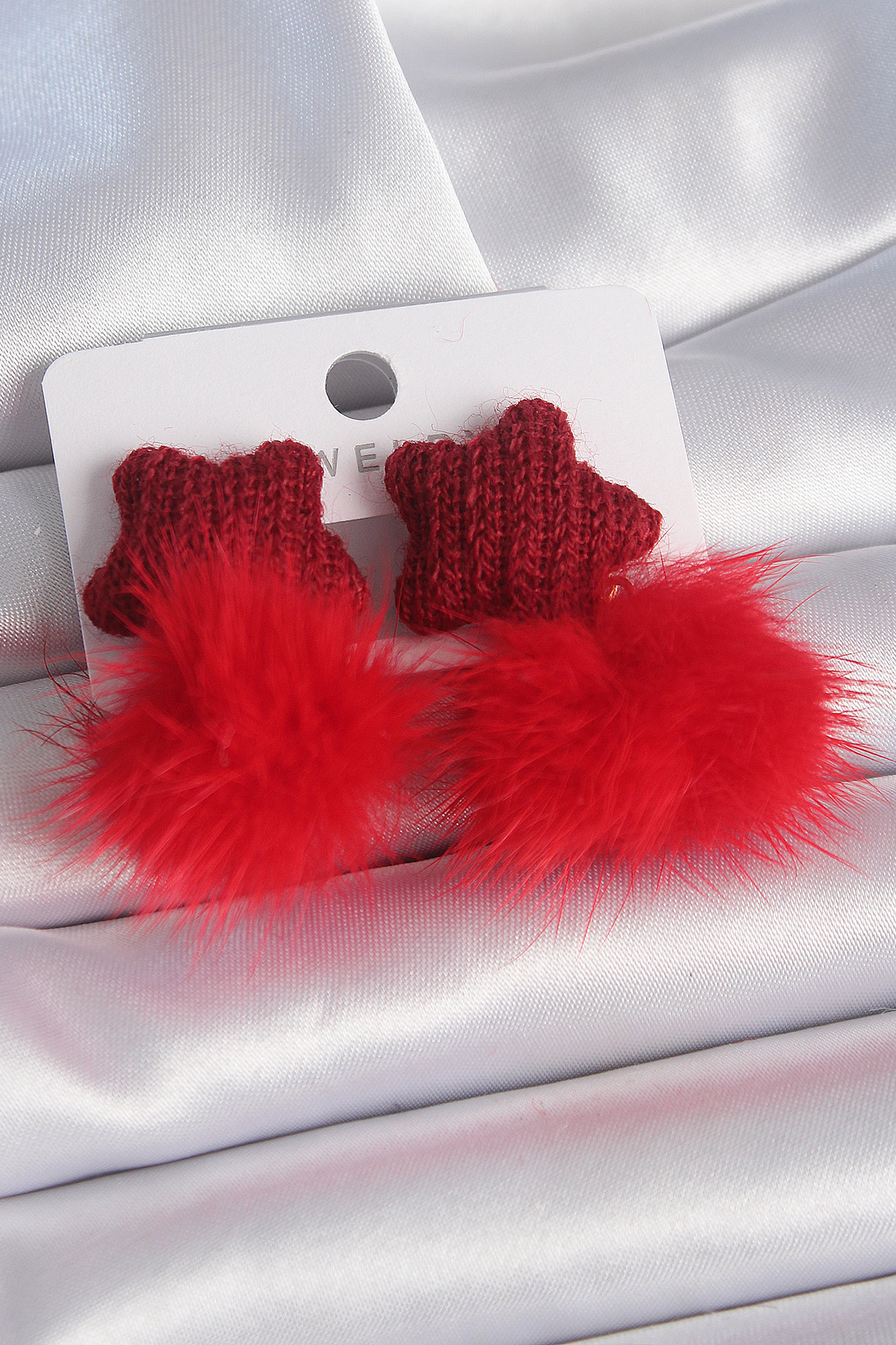 Kırmızı Renk Tüylü Yıldız Ponpon Model Kadın Küpe - 258205