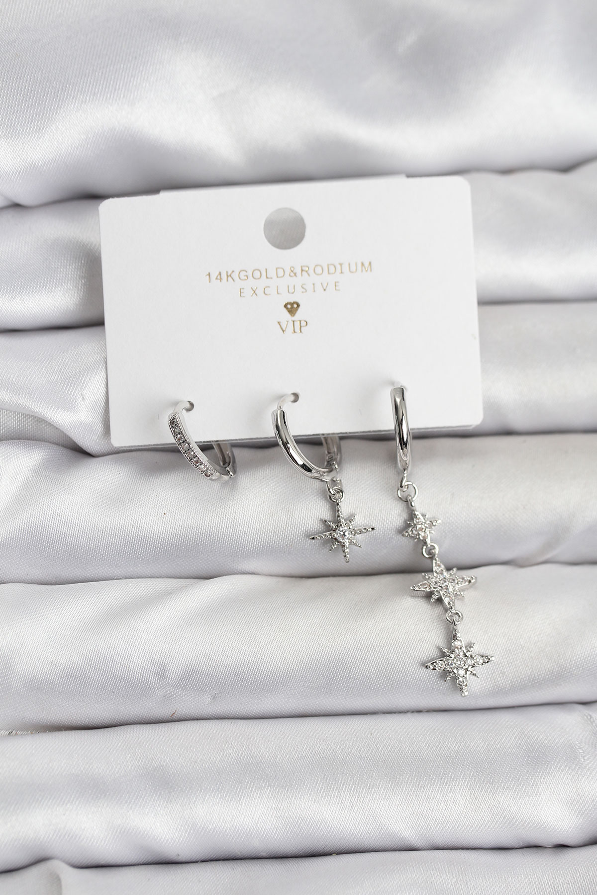 Kutup Yıldızı Model Gümüş Renk Pirinç 3'lü Kadın Küpe Seti - 266584