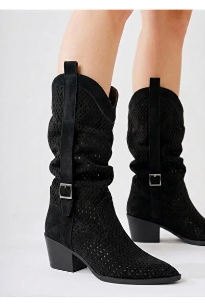 Meria Siyah Süet Lazer Kesim Kovboy Topuklu Çizme - 268493