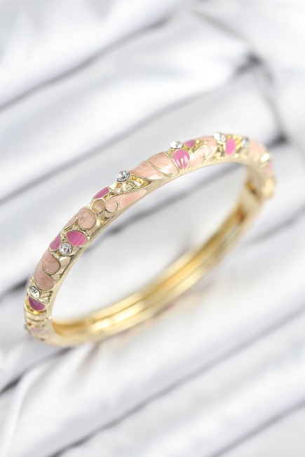Mineli Pirinç Zirkon Taşlı Pembe Çiçek Motifli Gold Kadın Kelepçe - 265278