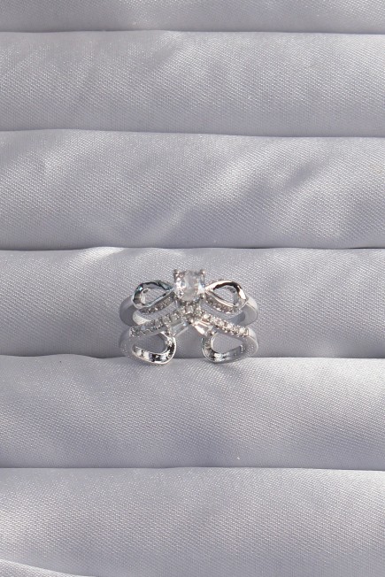 Pirinç Ayarlamalı Gümüş Renk Zirkon Taşlı 2li Görünüm Fiyonk Yüzük - 256797