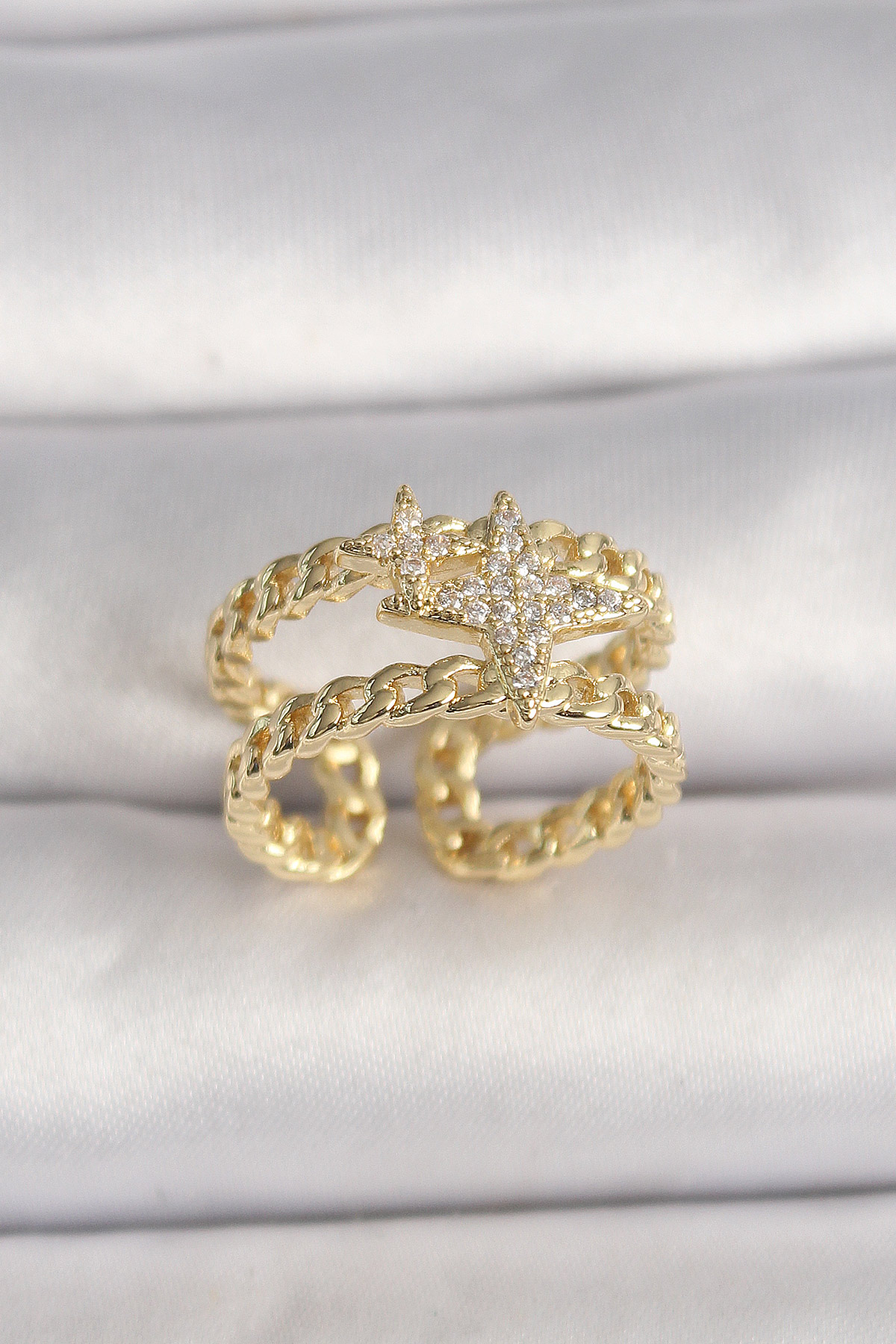 Pirinç Gold Renk 2'Li Zincir Zirkon Taşlı Yıldız Figür Kadın Yüzük - 260520