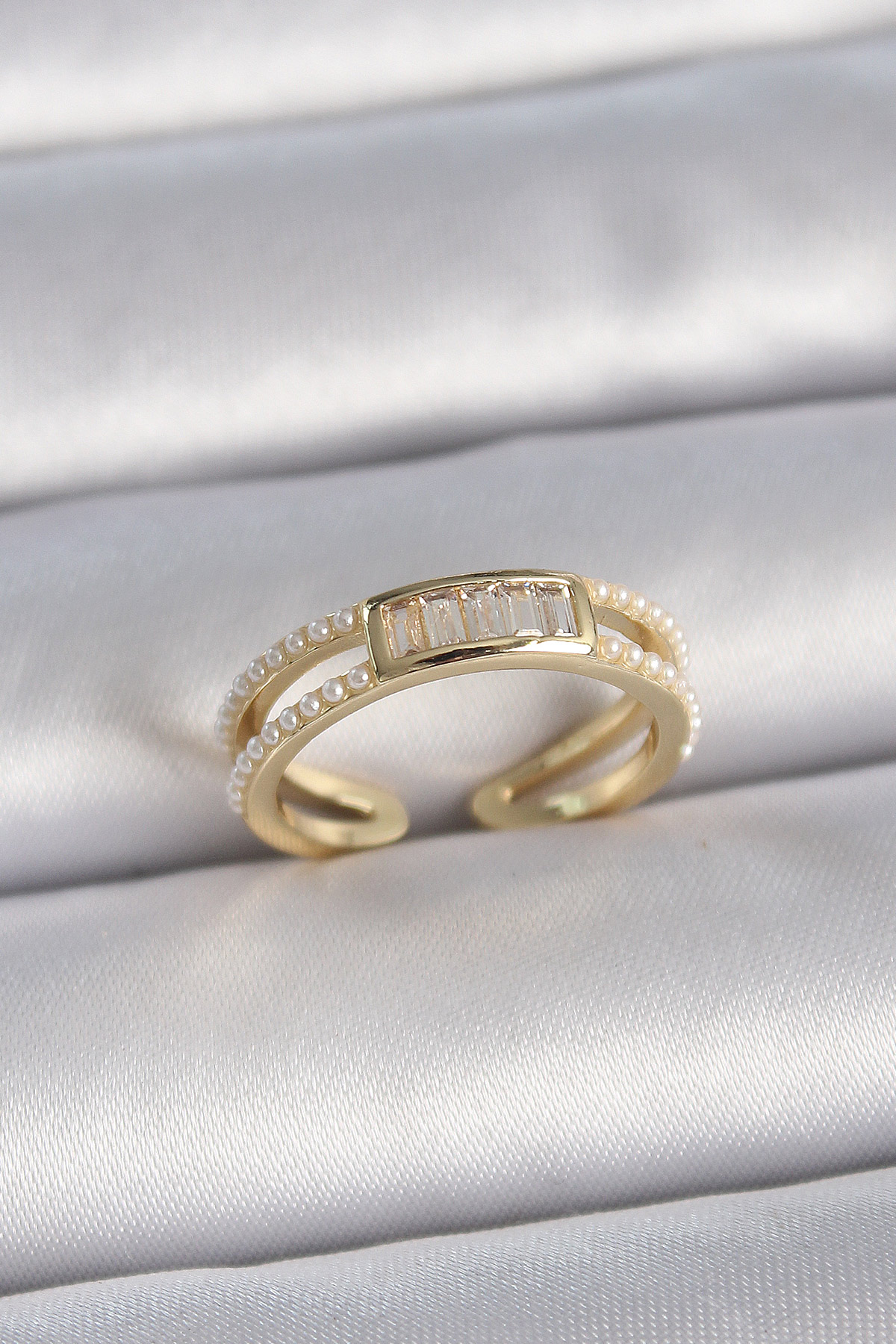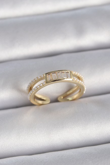 Pirinç Gold Renk Ayarlanabilir Sıralı İncili Zirkon Taş Detaylı Kadın Yüzük - 258717