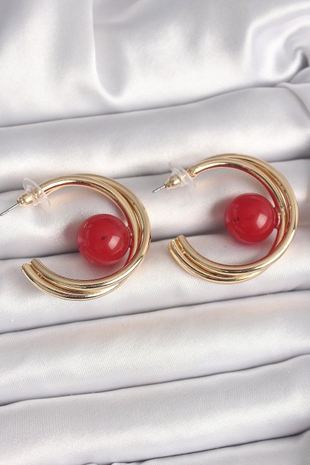 Pirinç Gold Renk Halka Model Kırmızı Boncuk Detay Kadın Küpe - 261456