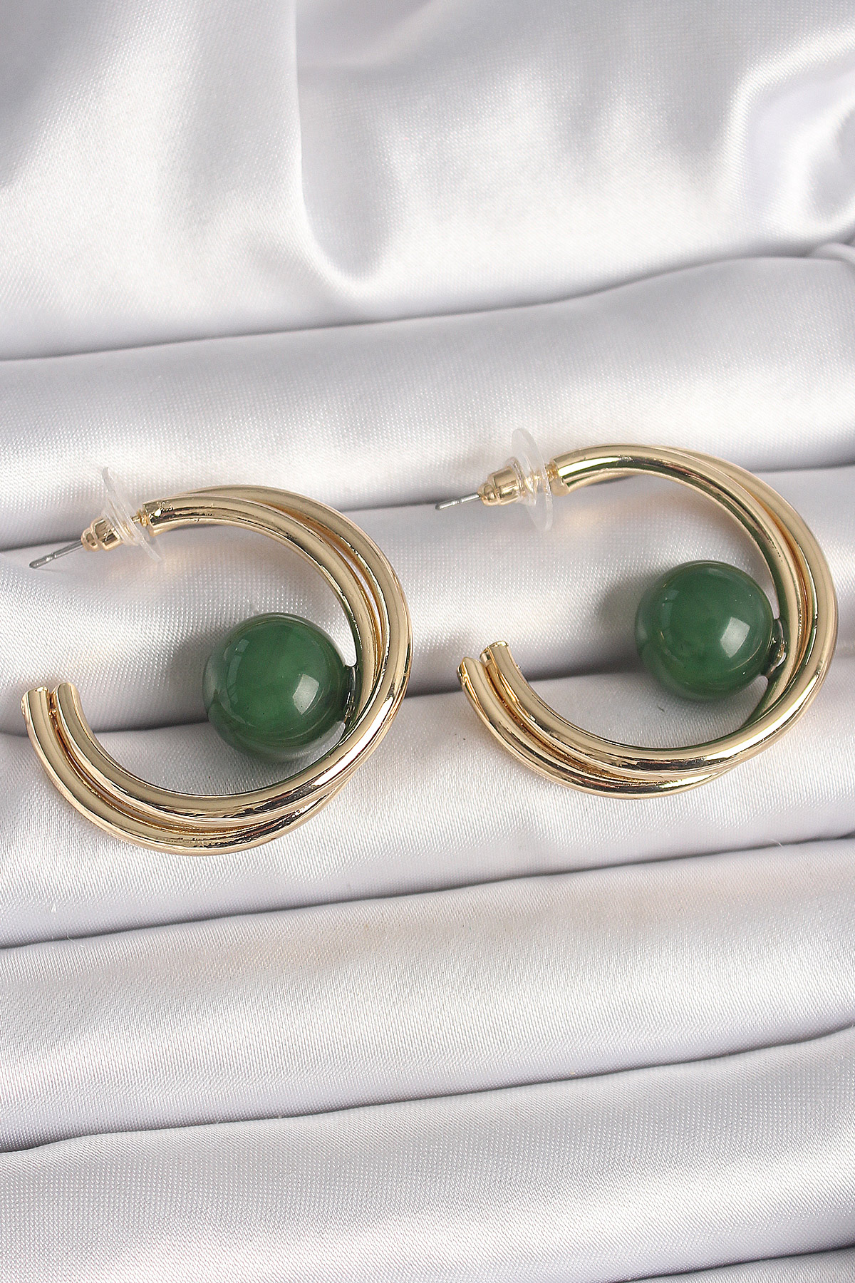 Pirinç Gold Renk Halka Model Yeşil Boncuk Detay Kadın Küpe - 261455