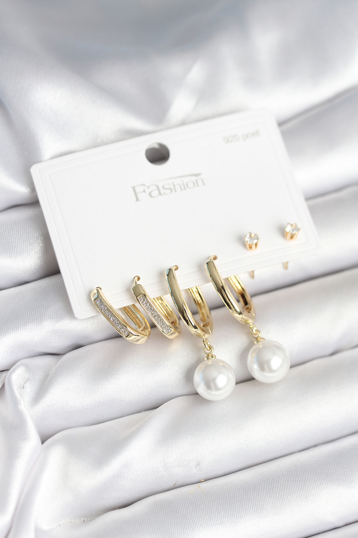 Pirinç Gold Renk İnci Detaylı 925 Ayar Gümüş Çivili Kadın Küpe Seti - 265952