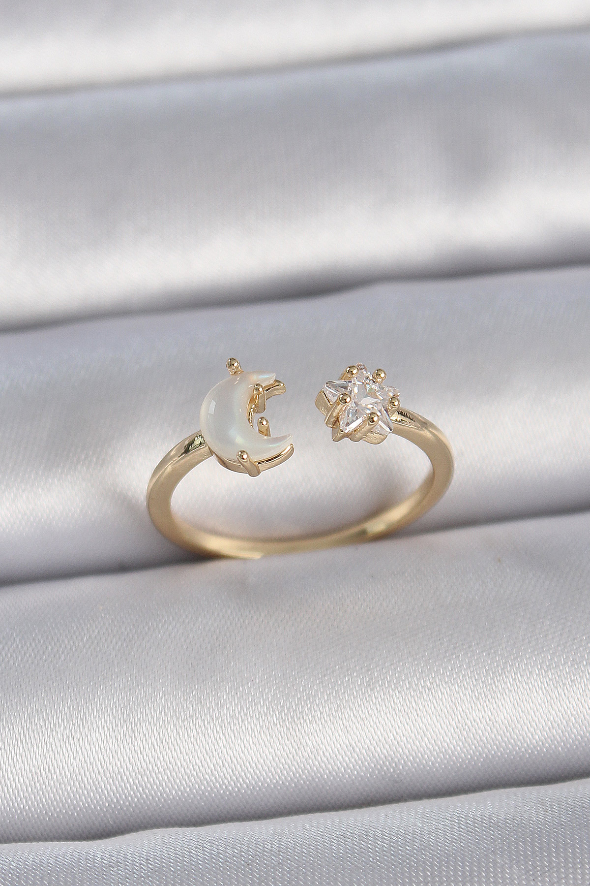 Pirinç Gold Renk İncili Hilal Zirkon Taşlı Yıldız Ayarlanabilir Model Kadın Yüzük - 258697