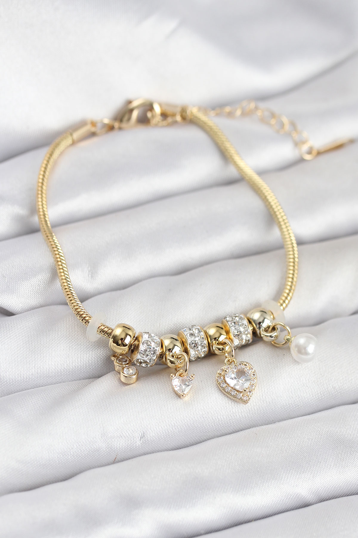 Pirinç Gold Renk Kalp Charmlı Kadın Bileklik - 266905