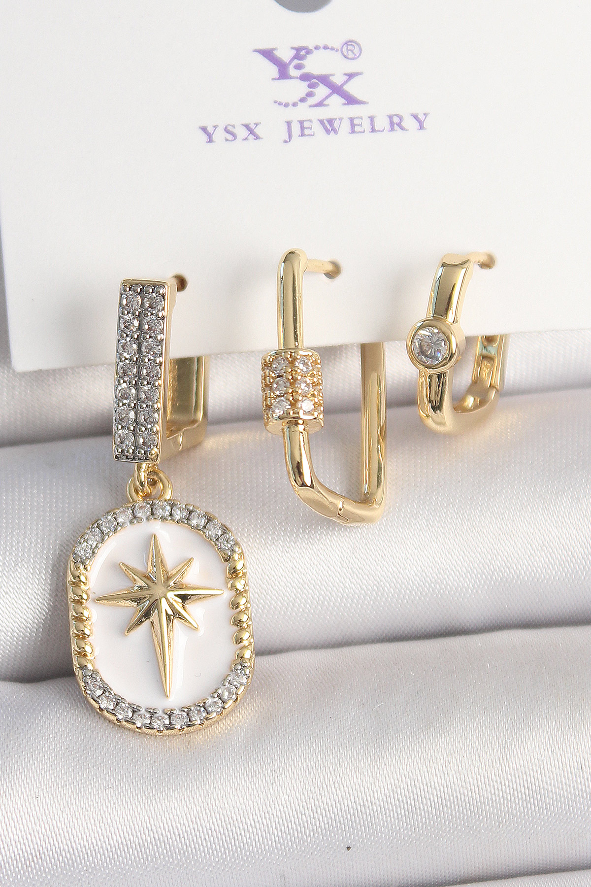 Pirinç Gold Renk Sallantı Zirkon Taş İşlmeli Yıldız Portre Model 3'Lü Kadın Kombin Küpe - 261932