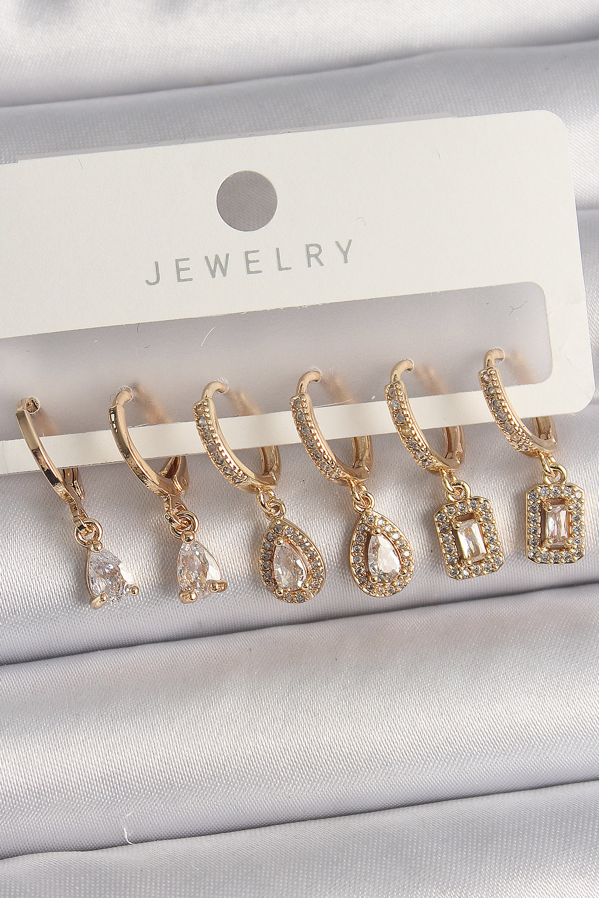 Pirinç Gold Renk Sallantı Zirkon Taşı Damla Model Kadın Küpe Seti - 260433