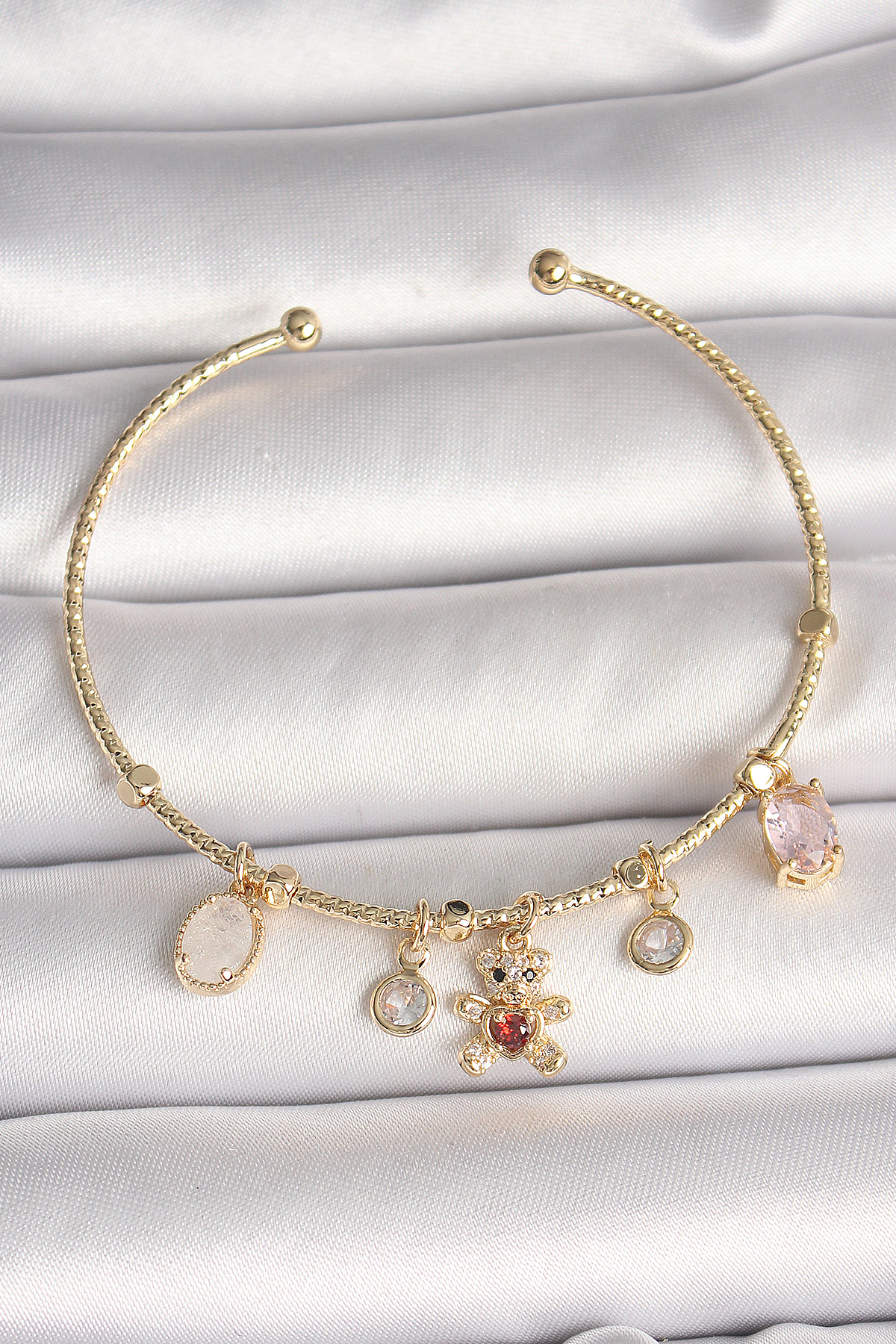 Pirinç Gold Renk Sallantı Zirkon Taşlı Ayıcık Figür Kırmızı Kalp Detay Charm Kadın Bileklik - 261688