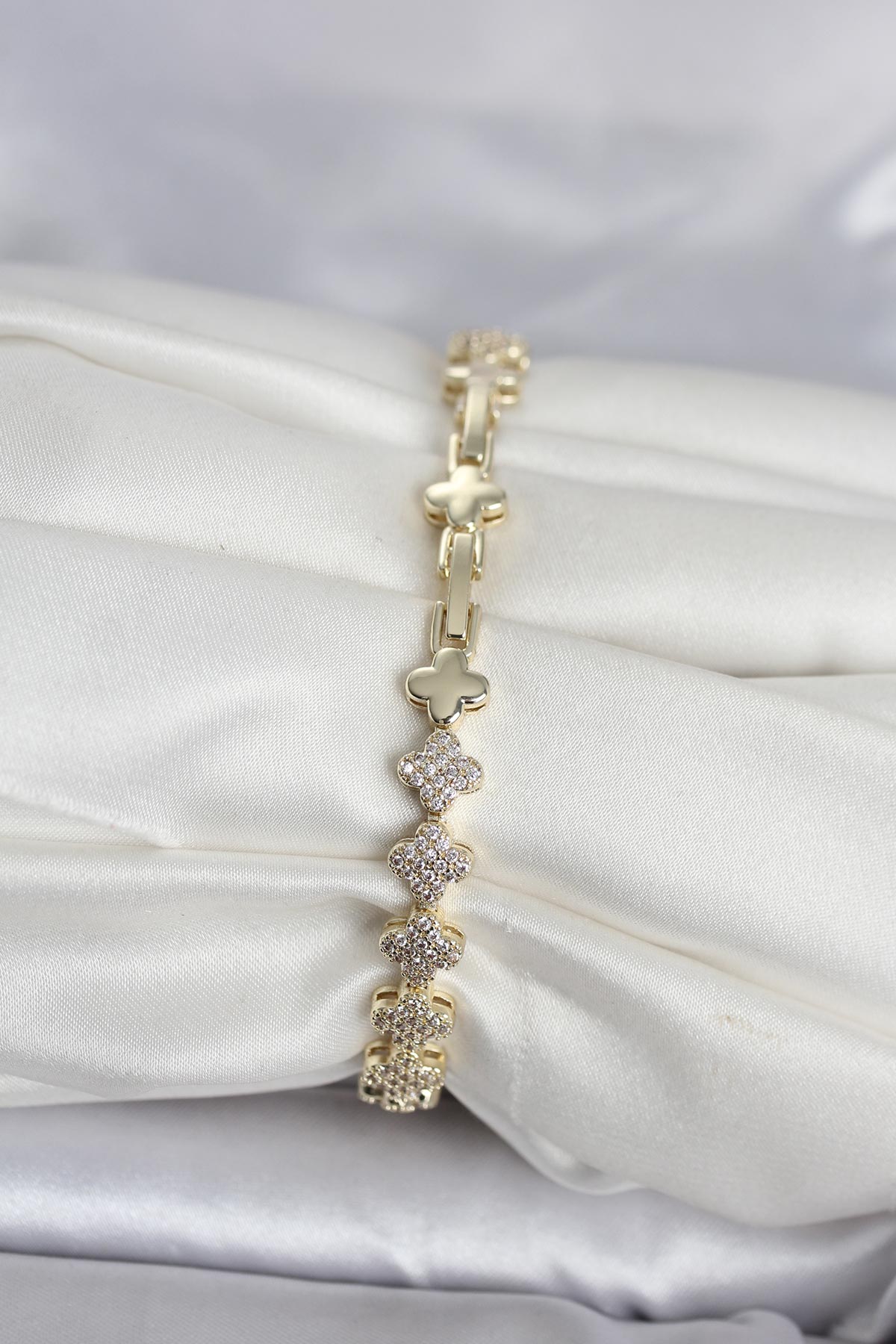 Pirinç Gold Renk Yonca Model Sıralı Zirkon Taşlı Kadın Bileklik - 268332