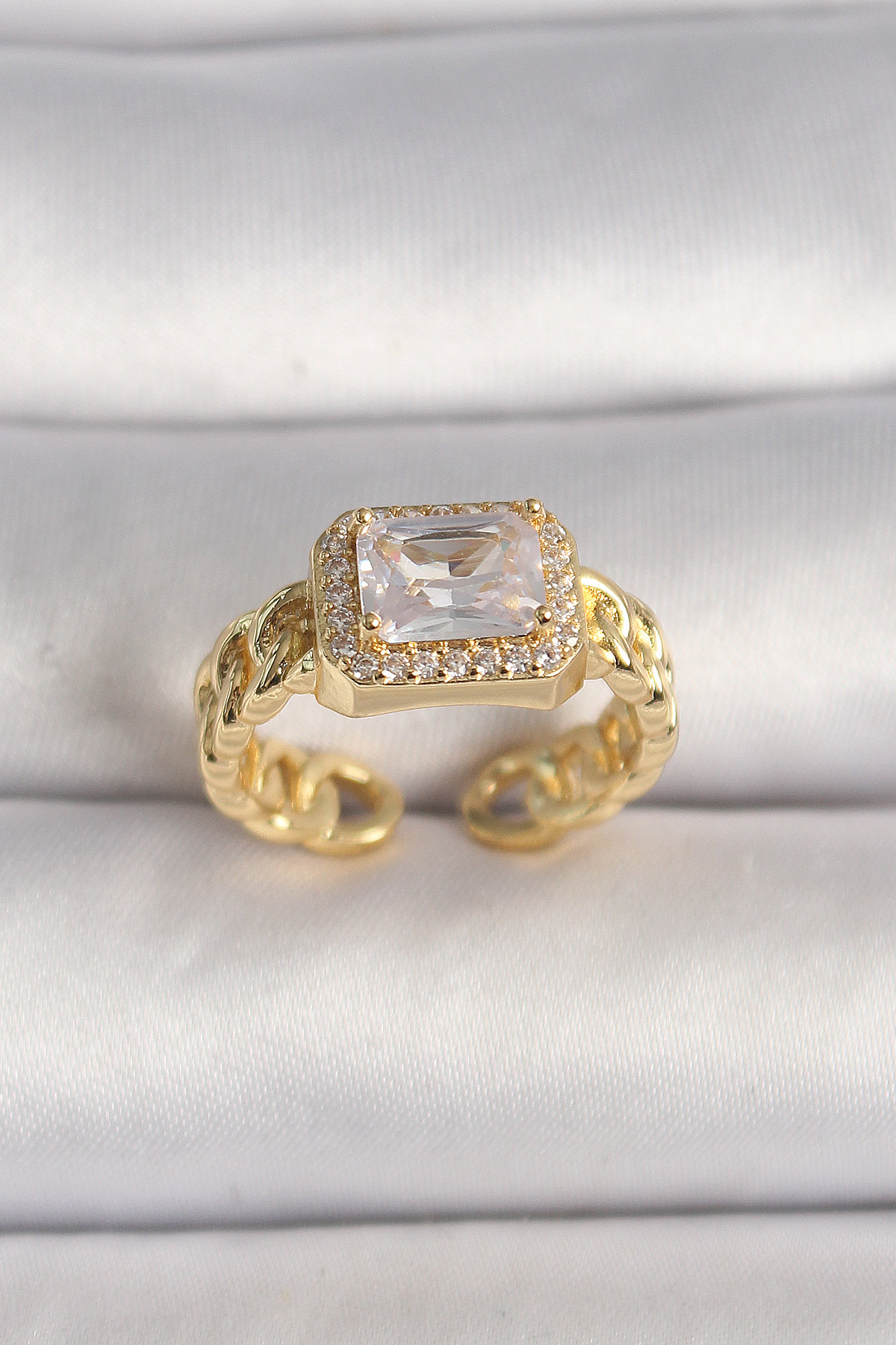 Pirinç Gold Renk Zincir Model Kare Zirkon Taşlı Kadın Yüzük - 260516