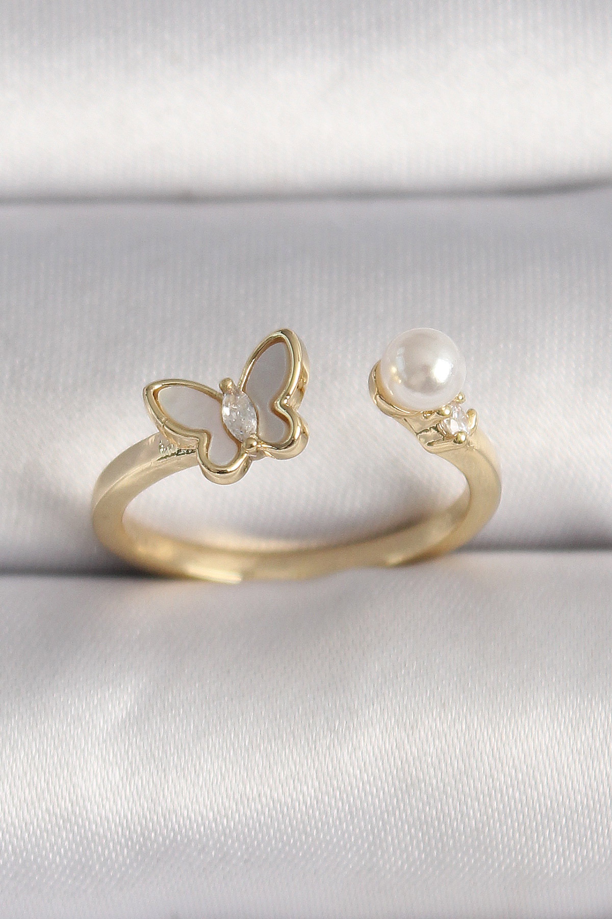 Pirinç Gold Renk Zirkon Taş Detaylı Beyaz Mineli Kelebek Model İnci Detay Ayarlanabilir Yüzük - 259940