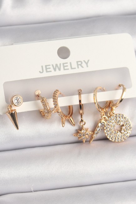 Pirinç Gold Renk Zirkon Taşlı Çoklu Figür Kadın Küpe Seti - 260416