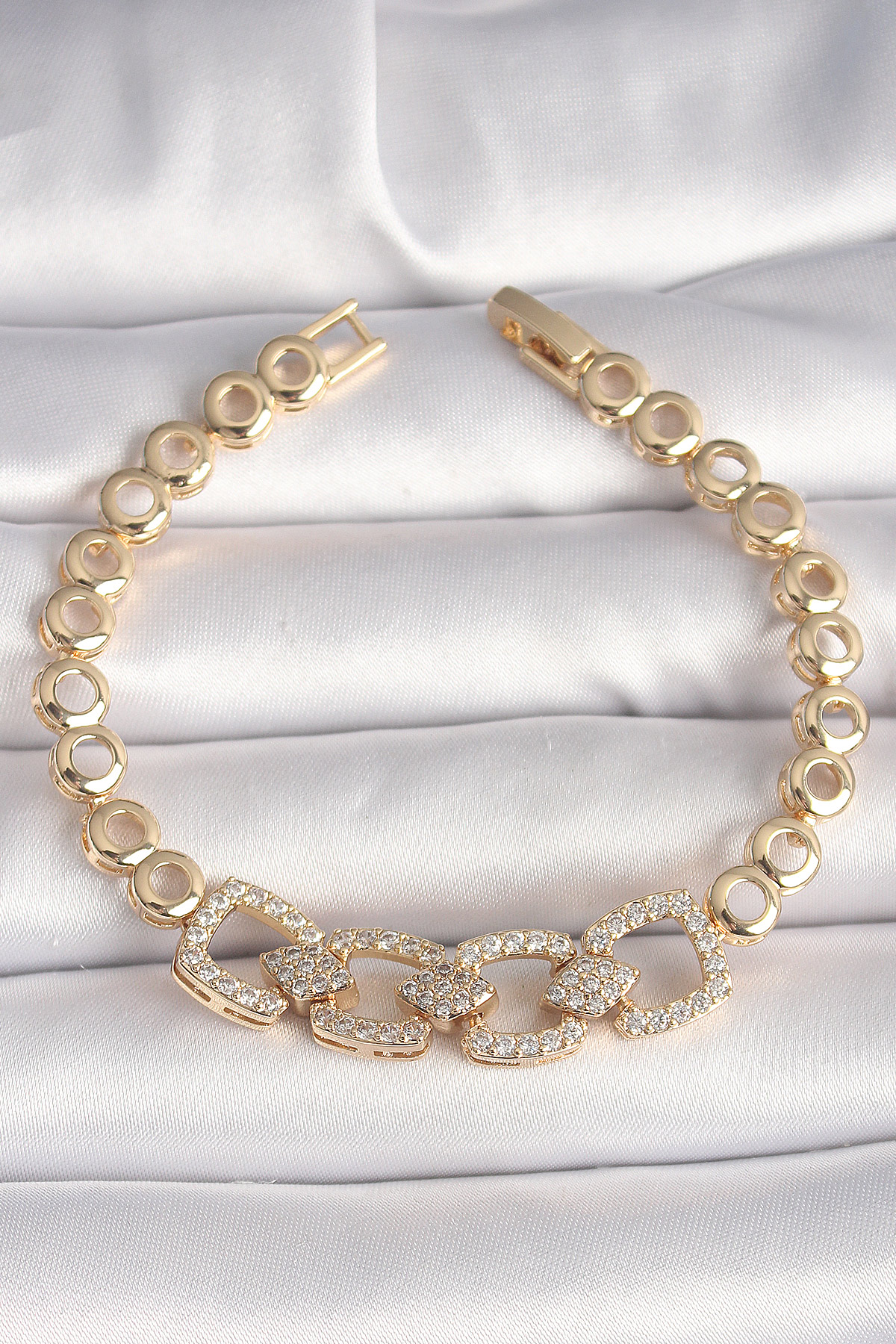 Pirinç Gold Renk Zirkon Taşlı Daire Zincir Model Kadın Bileklik - 261051