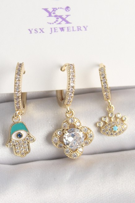 Pirinç Gold Renk Zirkon Taşlı Fatma Ana El Yonca Figür Göz Detay 3'Lü Kadın Kombin Küpe - 261929