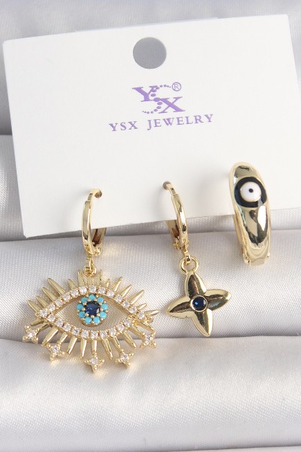 Pirinç Gold Renk Zirkon Taşlı Göz Figür Nazar Boncuk Detay 3'Lü Kadın Kombin Küpe - 261919