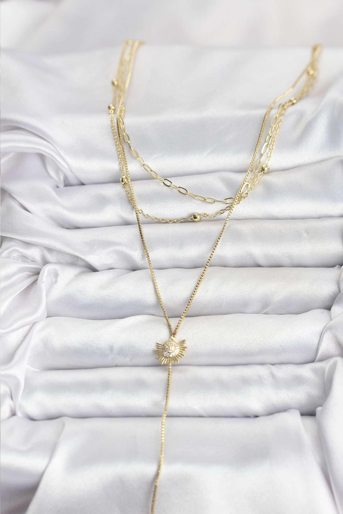 Pirinç Gold Renk Zirkon Taşlı Güneş Model Detaylı 3'lü Kombin Y Kadın Kolye - 266323